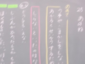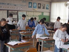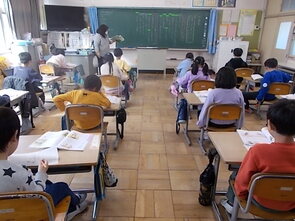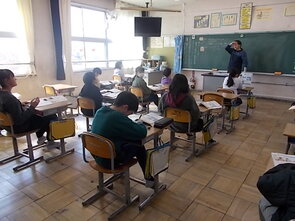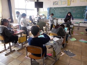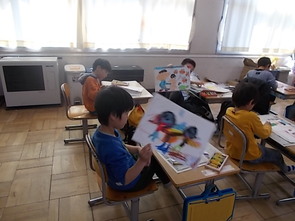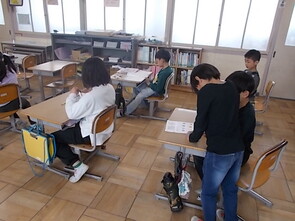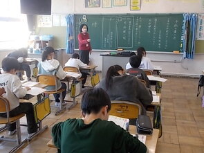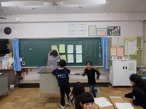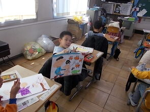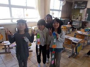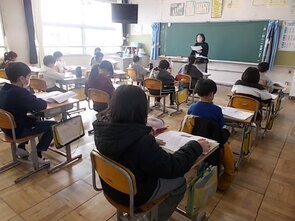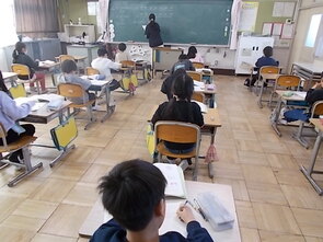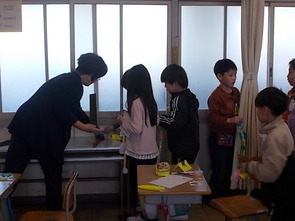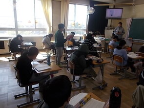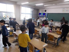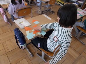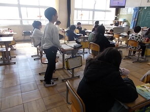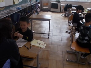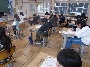 1年生は、国語の教科書の後ろにまとめて綴じてある1年生で習うかん字一覧を囲んで、にている漢字をグループで集めていました。集めた個数で点数化されるようです。1年間で多くの漢字を学習できました。来年度は、また新しい漢字を学習できます。楽しみですね。