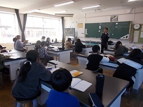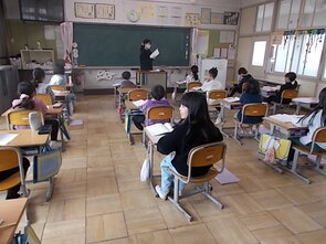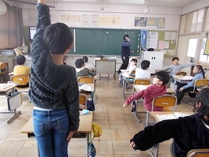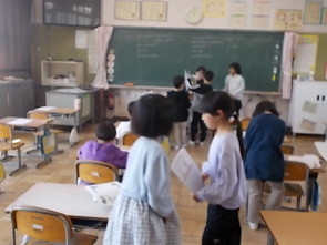 リコーダー練習に続いて、先生のピアノの伴奏に合わせて、「歩こう!歩こう!」と振付をしながら歌いました。「懐かしい」という子どもたちの声と、「もっと大きく!」という先生の声に呼応して元気のよい歌声が続きました。
