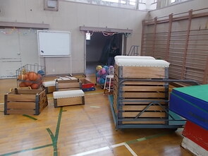 6年生は卒業式用に椅子や絨毯が敷かれた体育館の西側でマット運動を楽しみました。