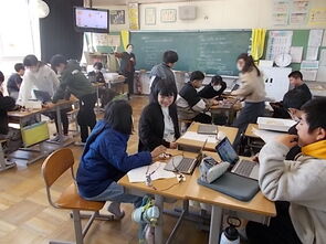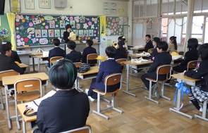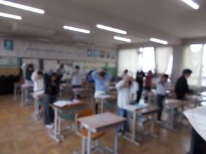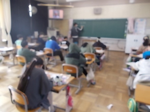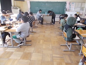 3年教室は近づくと薄暗く、静かな雰囲気が漂っていました。人がいるのかなと思いながら、教室に入ると、発表会を行っていました。集中して級友の発表を聞く態度から、3年生の成長を感じました。