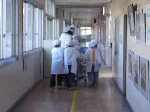 毎日、4限終了後、支援員さんに付き添われて、1年生が給食のワゴンを運びます。