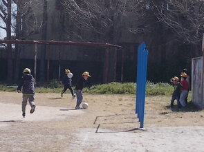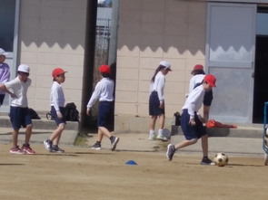 サッカーをしました。担任の先生から「ボールを蹴ります。体からできるだけ離さないように蹴るよ。」という指示を受けて、各自で東に向けてサッカーボールを蹴りながら走りました。全員が集合するまで、ボールタッチでボール慣れをしました。次に「ドリブルをして先生の近くまで集合!」という声がかかると、「ドリブルって何?」と素直に反応する返事が聞こえました。今日は、ボールを蹴りながらドリブルという言葉を学んだようです。その後、ペアでサッカーボールの取り合い遊びをしました。終始、「ワハハ」「ヒヒヒ」と取り合いゲームを楽しむ声がありました。