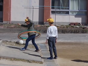 フラフープを上手にする子の姿が増えてきました。1年生は、ボールを蹴る遊びが増えてきました。