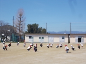 今朝、登校時に「今日は運動場で遊べるかな?」とつぶやきながら校門をくぐる子がいました。昨日まで、雨の影響で運動場を活用できませんでしたが、2年生が運動場で体育を行いました。写真はケンケンパッとリズムに乗りながら、走っているところです。