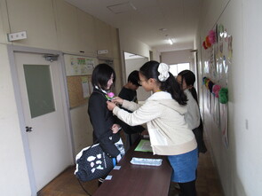 6年教室の廊下で、1人ずつ通知表を手渡しされていました。担任の先生と言葉を受けて、「ありがとうございました」と言葉を伝えながら、通知表を受け取っていました。
