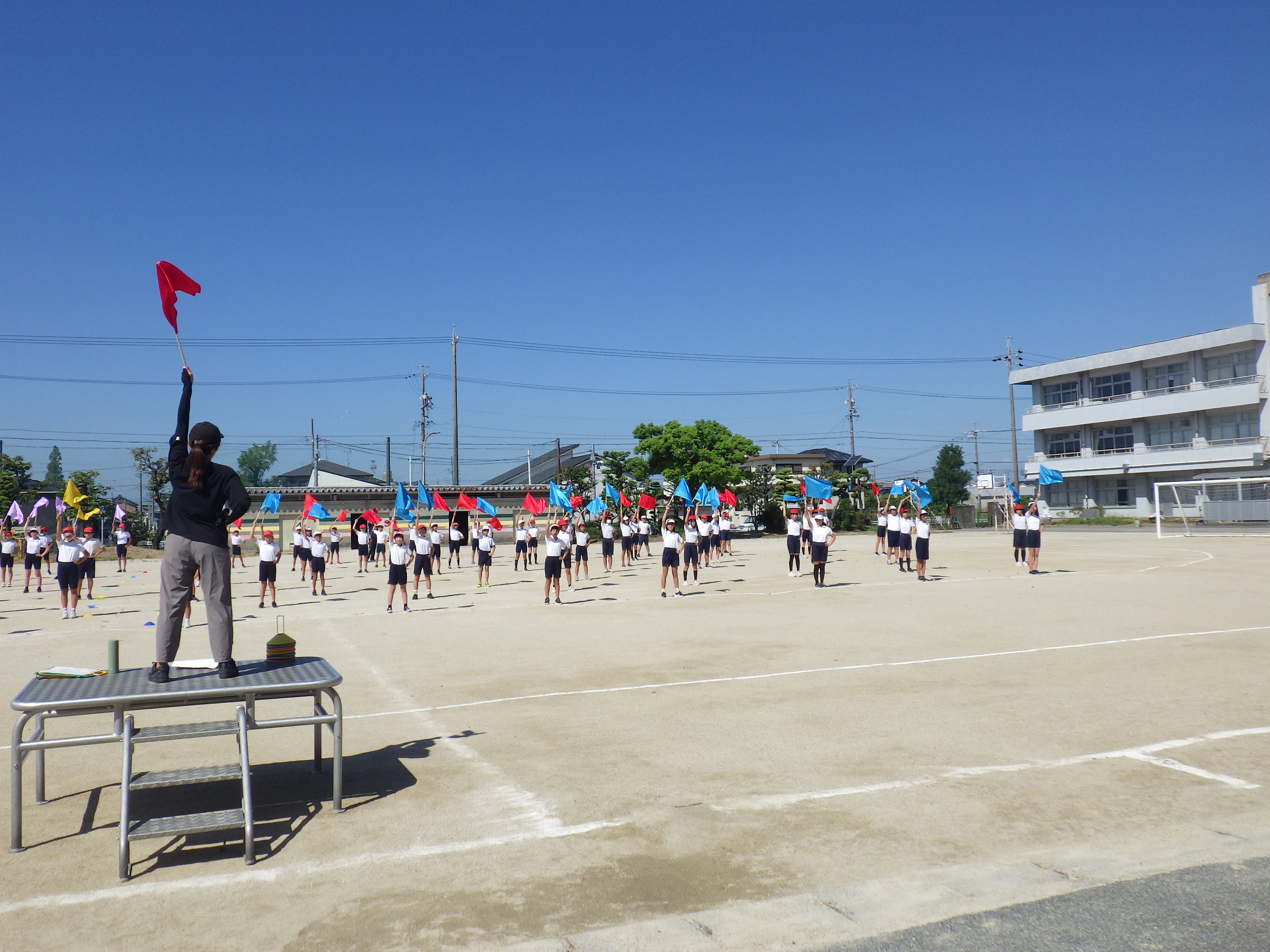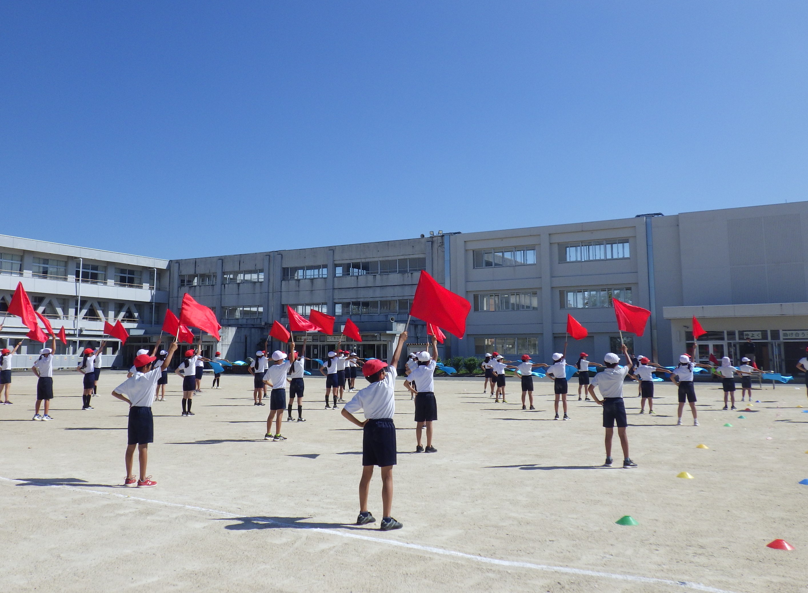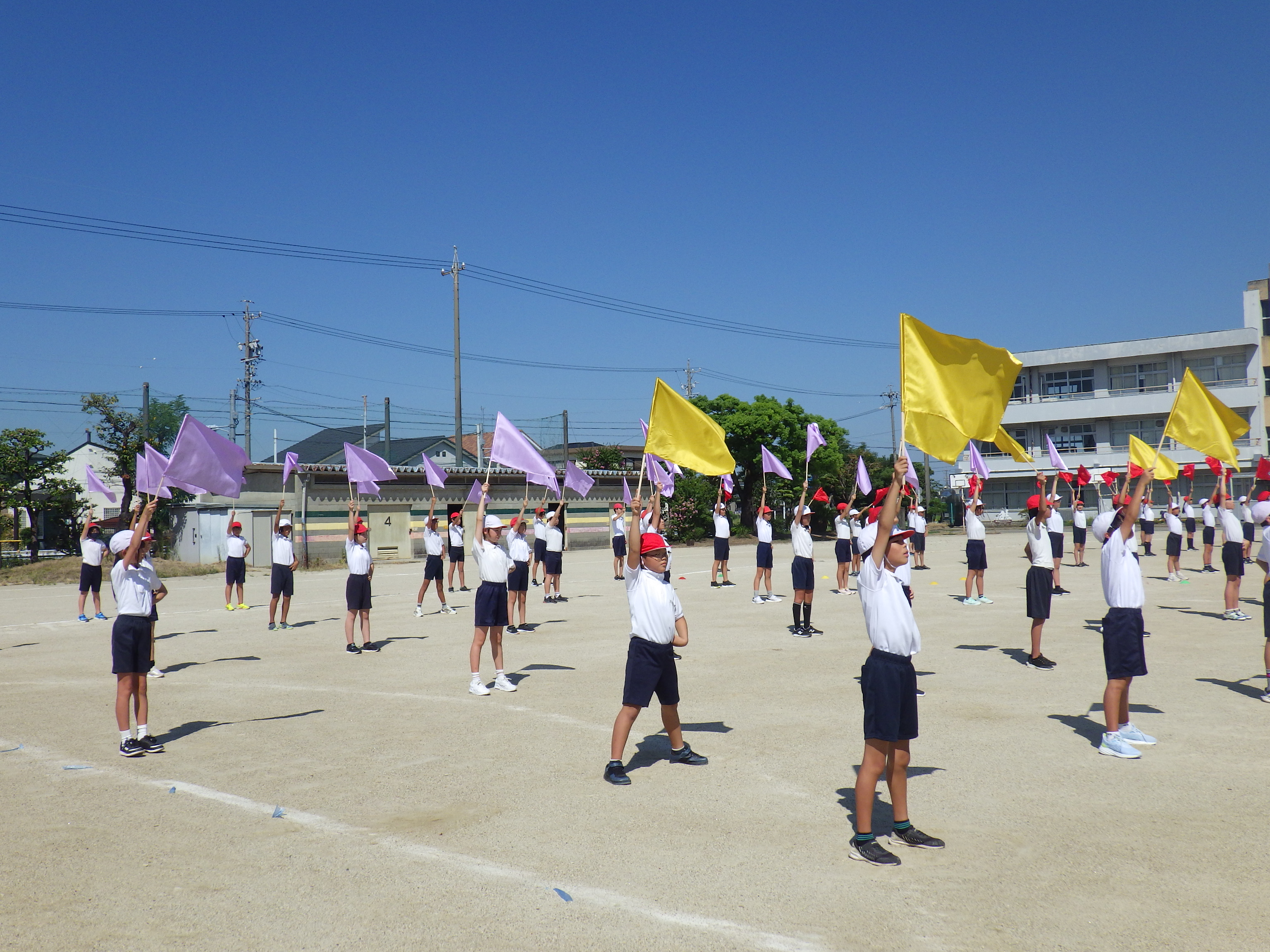 6年生は、学級ごとに異なる色のフラッグを持ち、全員の動きがそろうよう、心をひとつにして練習に励んでいます。