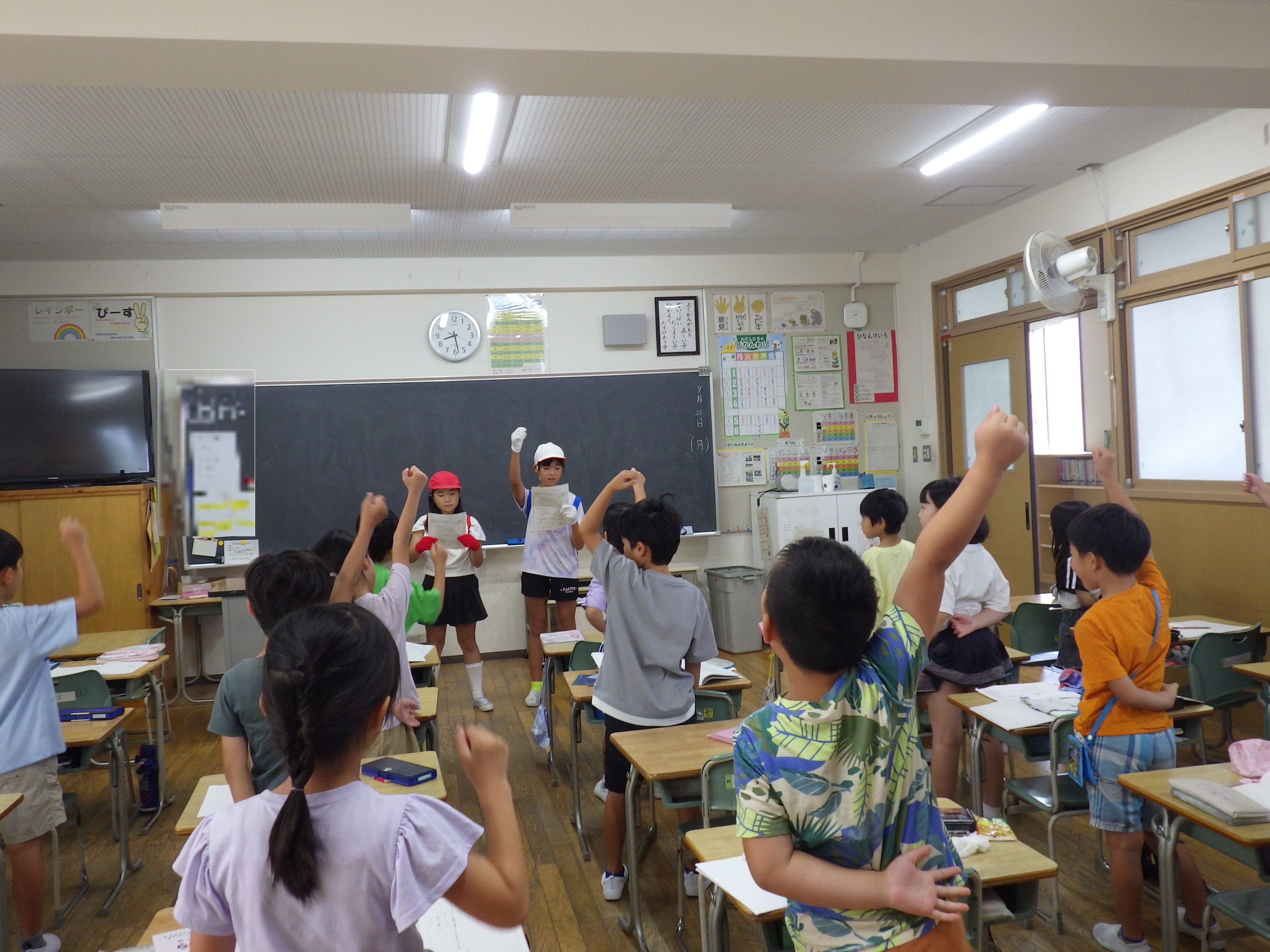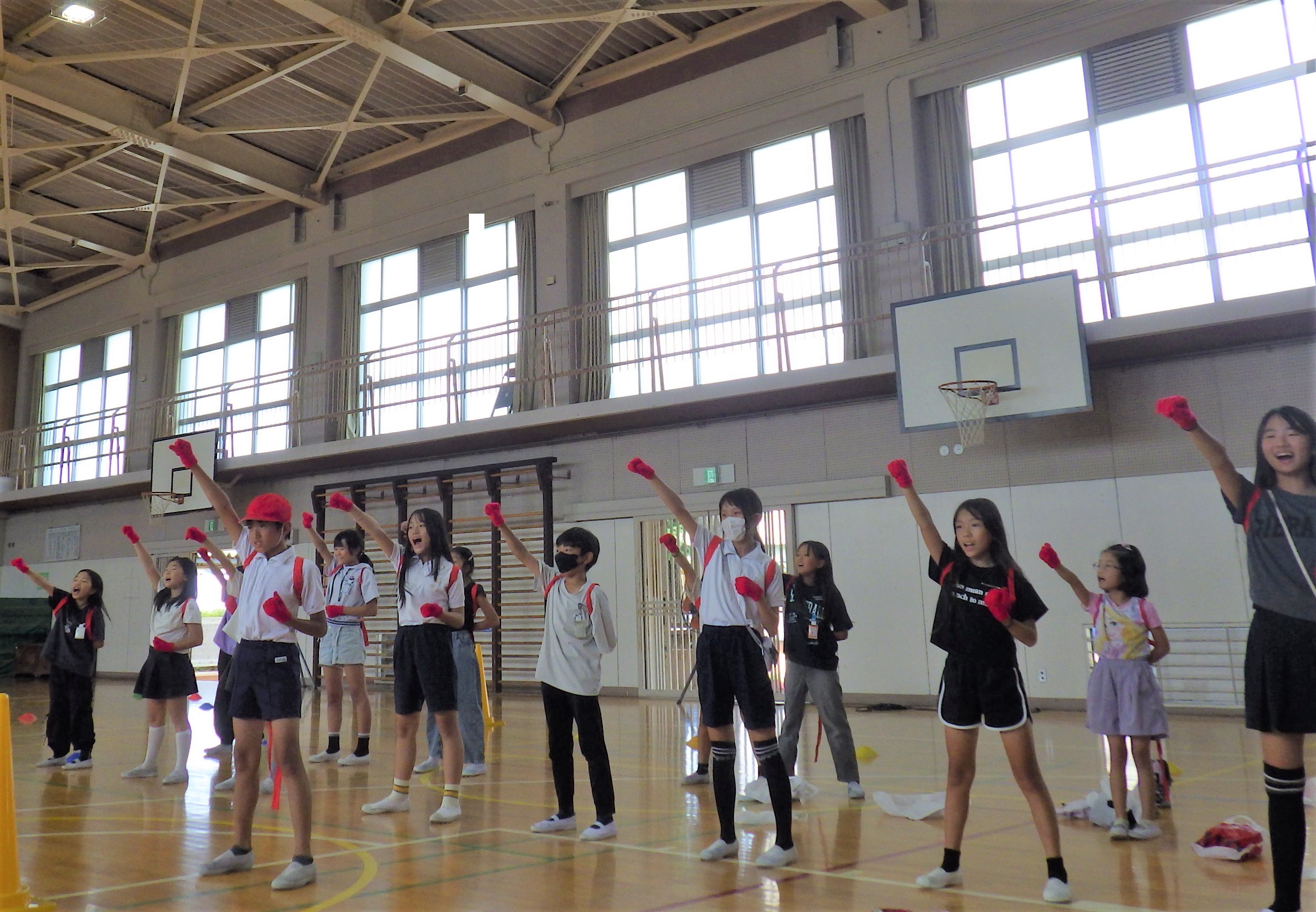 応援練習(9月22日) 応援団は、毎日昼休みに応援合戦の練習をしています。22日には、各クラスをまわり、「赤組がんばるぞー!」『ファイヤー!』「白組がんばるぞー!」『サンダー!』の掛け声練習を行いました。 最後は「下津っ子、がんばるぞー!」『おー!』で全員声をそろえ、心を一つに運動会を盛り上げます。