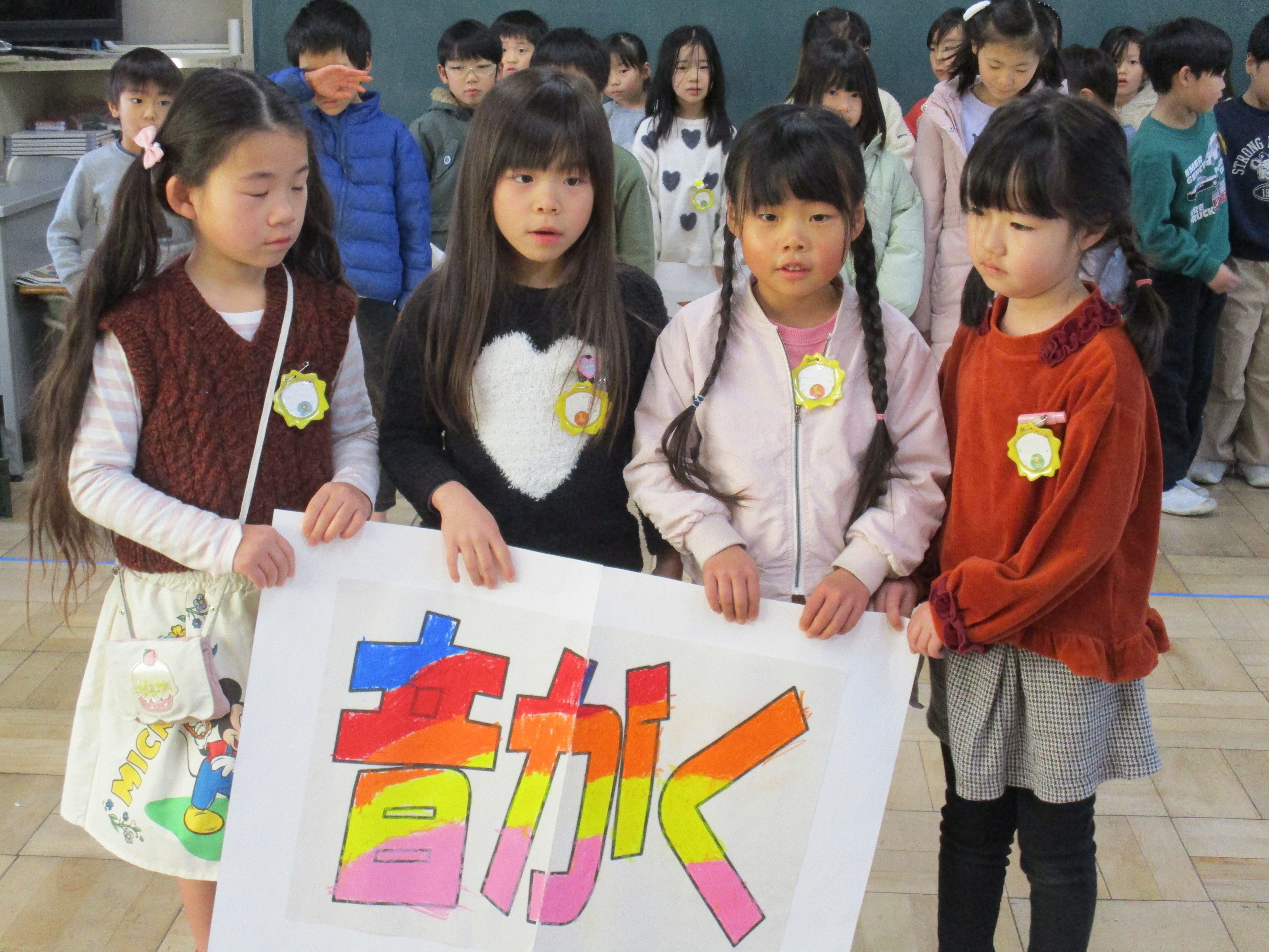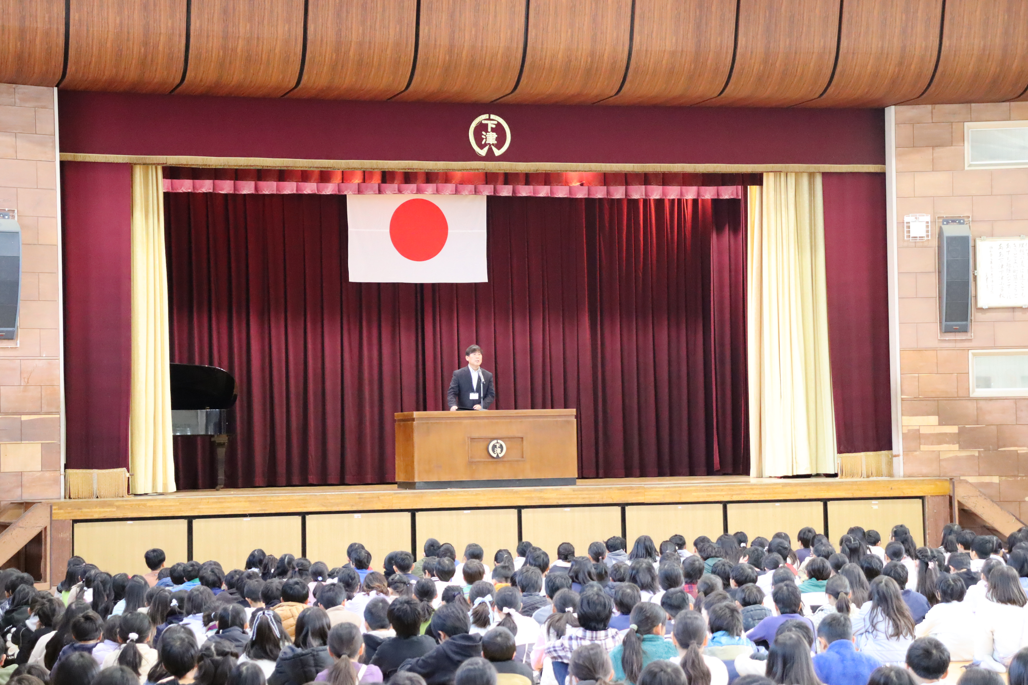 挨拶いっぱいの学校に! 2学期末から、通学団の班長会で、気持ちのよい挨拶がいっぱいになるように話し合ってきました。 1月26日の朝礼では、班長会のリーダーたちが全校児童に挨拶の手本を見せ、みんなで元気な挨拶をしようと呼びかけました。 今週の週訓は「自ら進んで挨拶を10回以上しよう」です。自分から、相手の顔を見て気持ちのよい挨拶のできる下津っ子がもっともっと増えるとうれしいです。