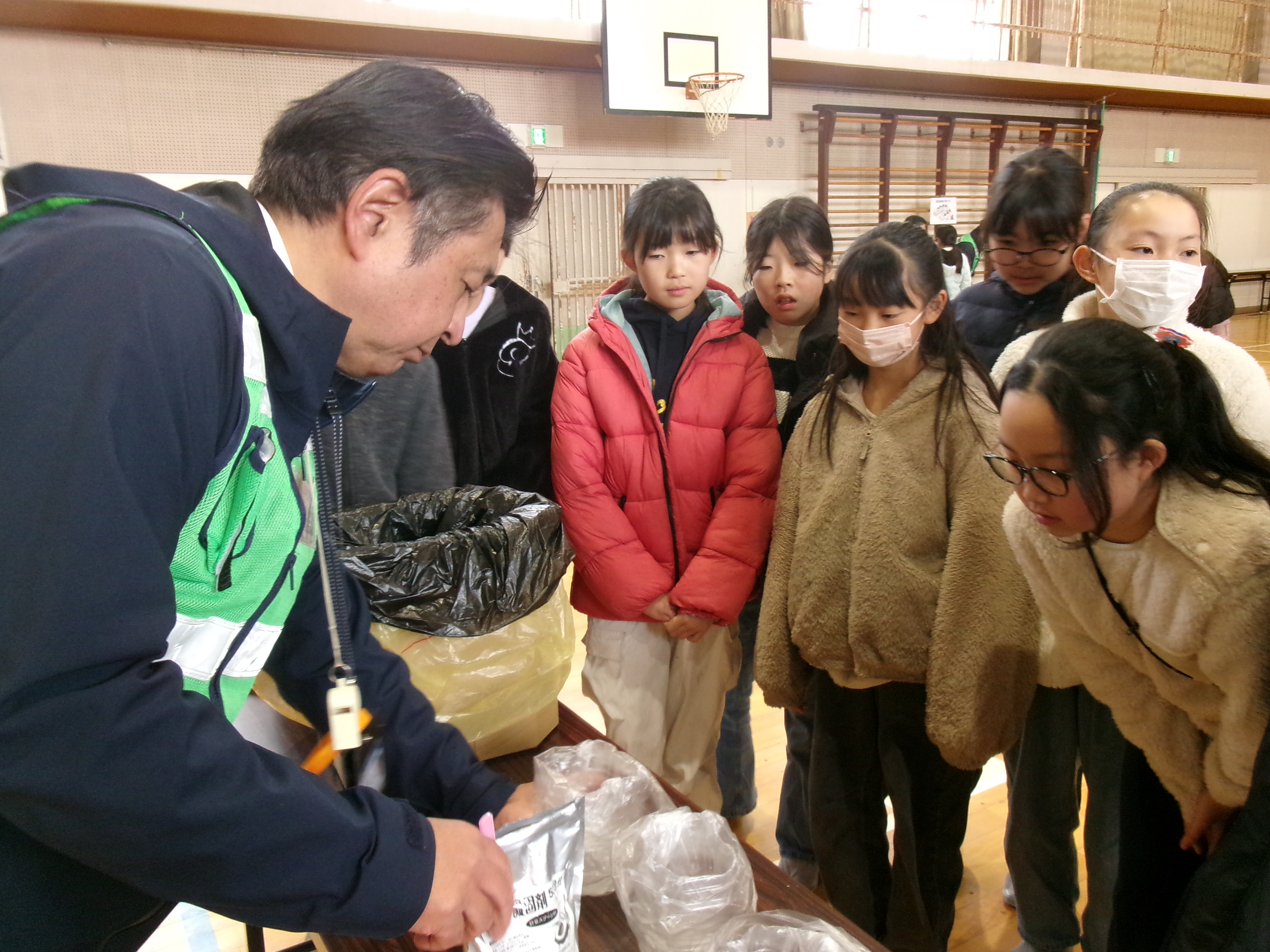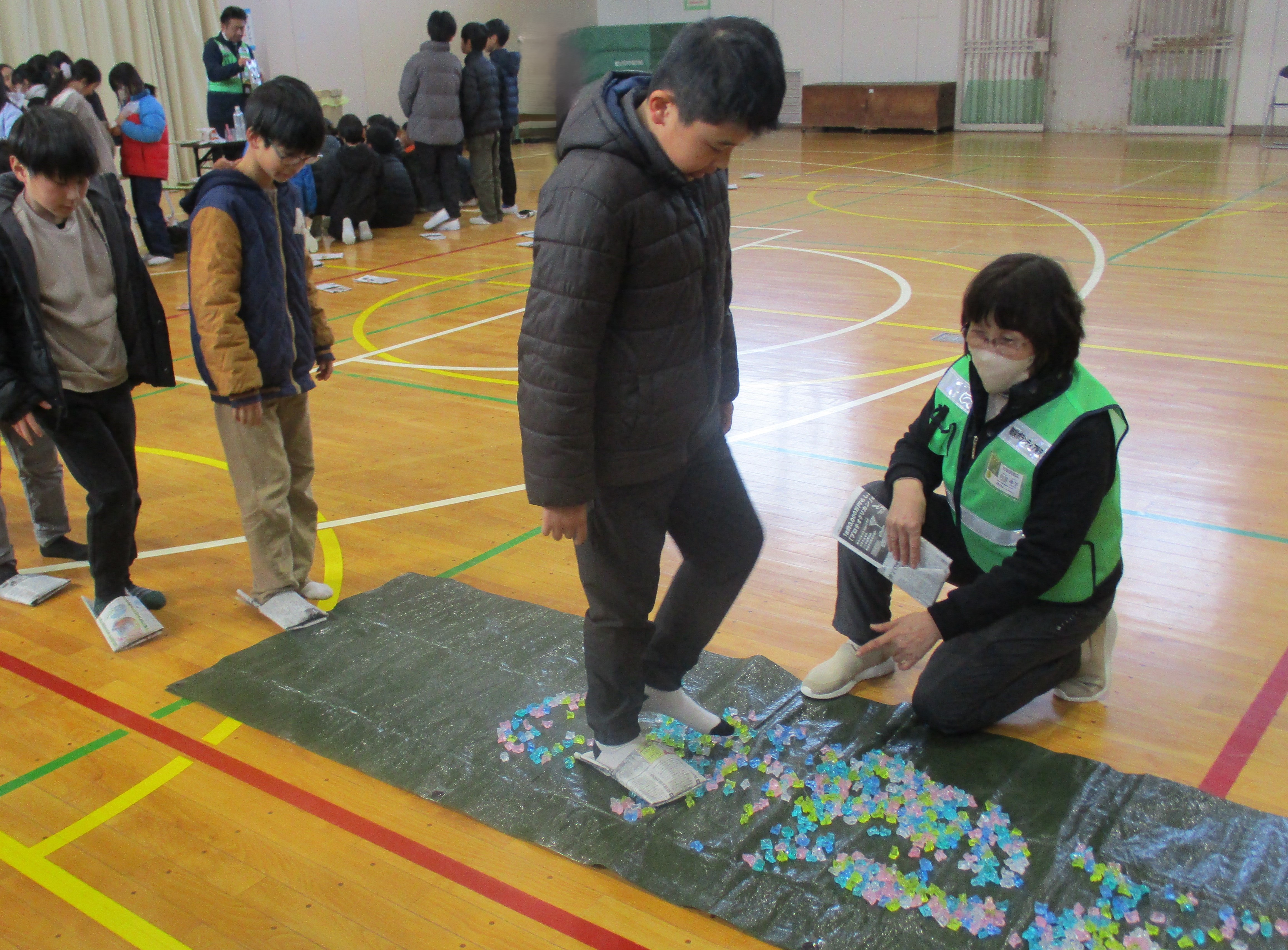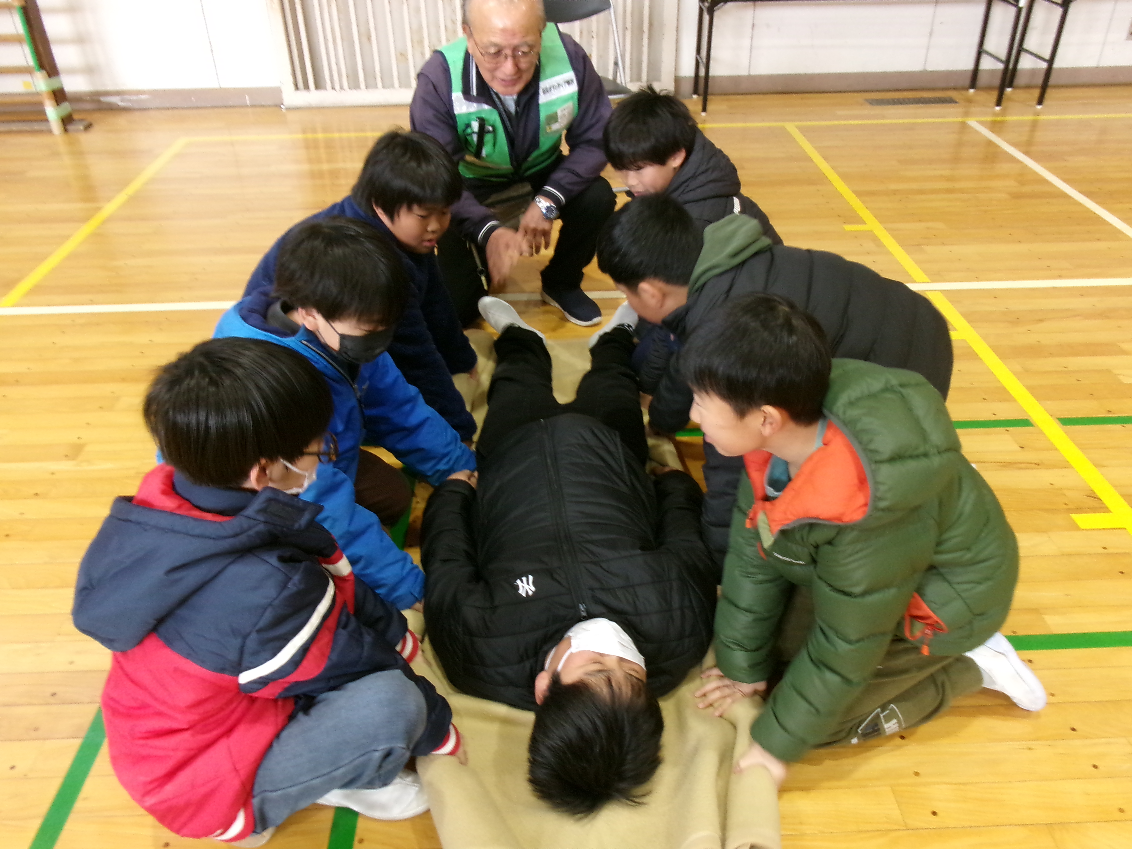防災教室(1月30日) 防災ボランティア稲沢の方6名をお招きし、5年生が防災について学習をしました。「新聞紙のスリッパ作り」「簡易トイレ作り」「応急担架作り」などの体験を通して、災害に備えることの大切さを学びました。