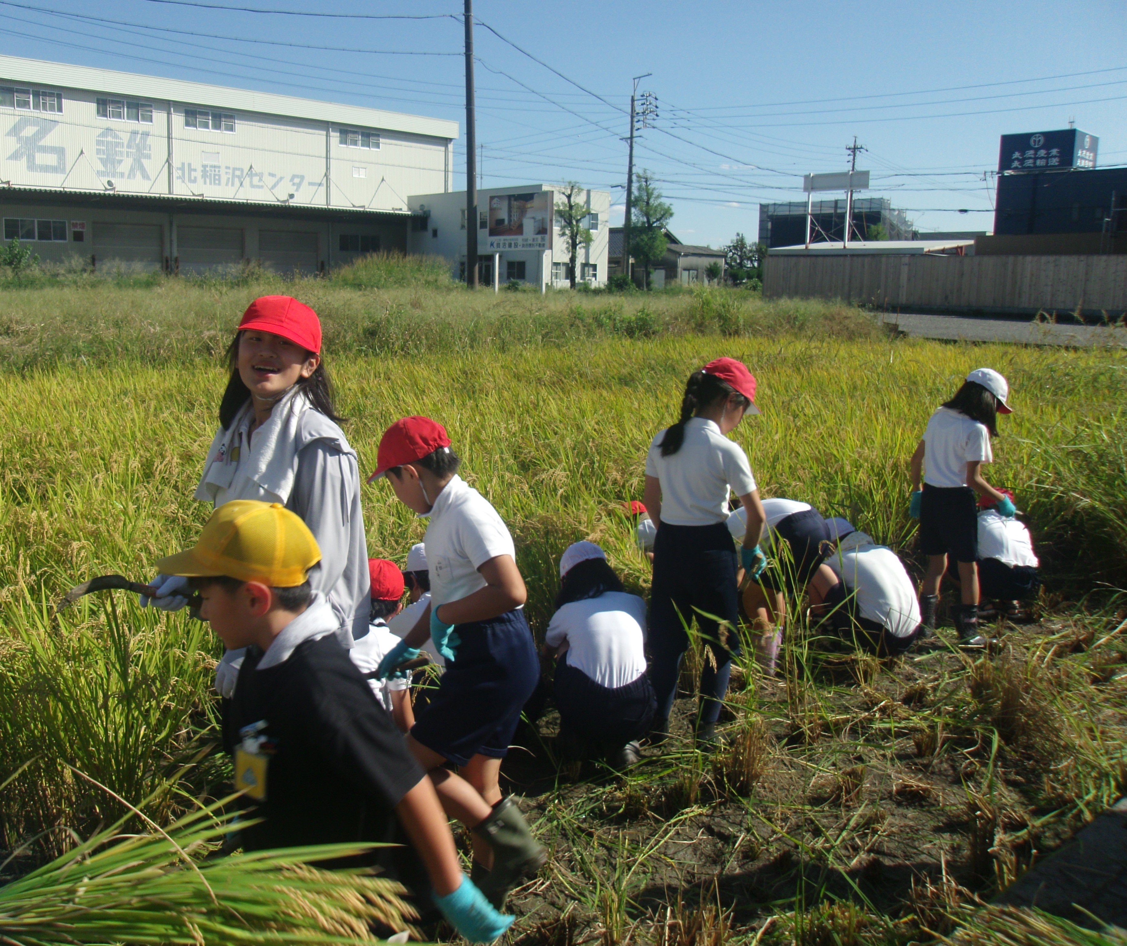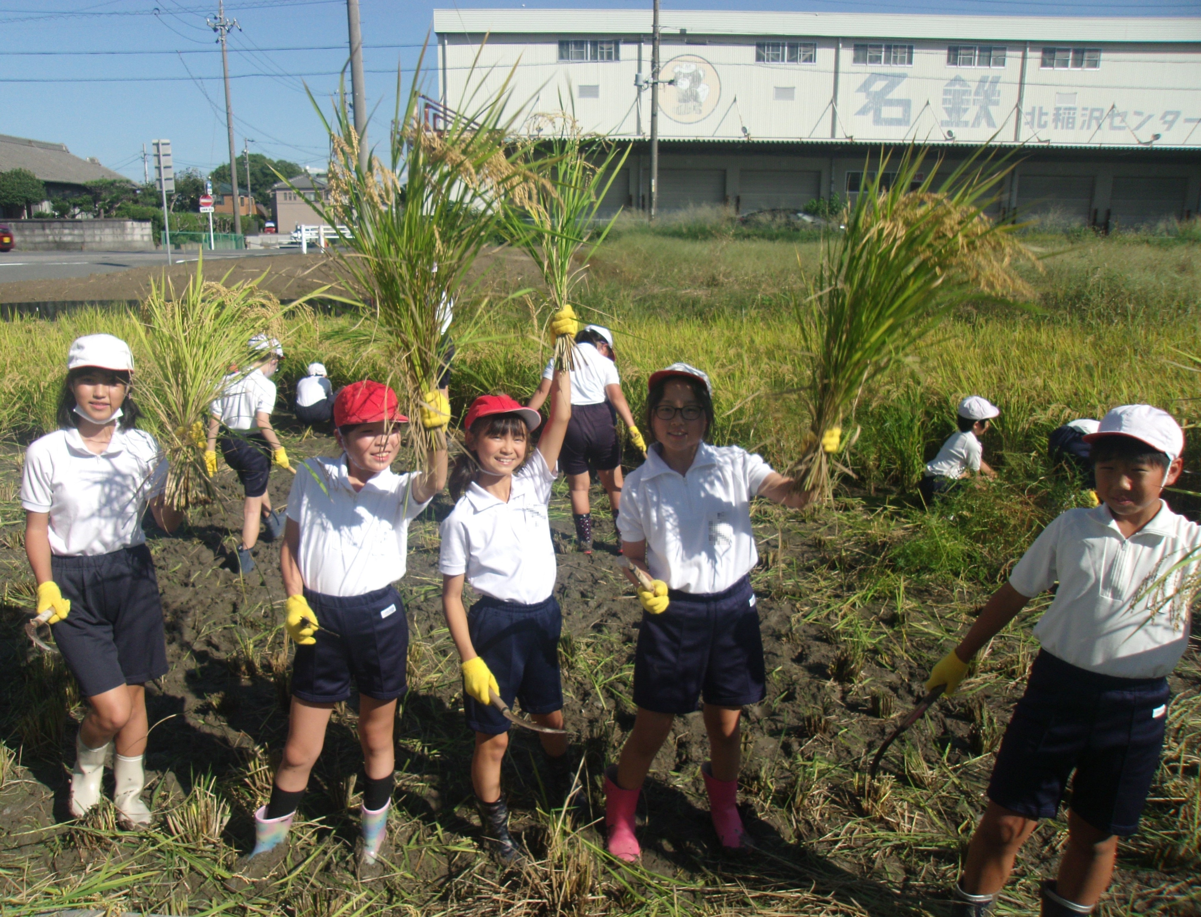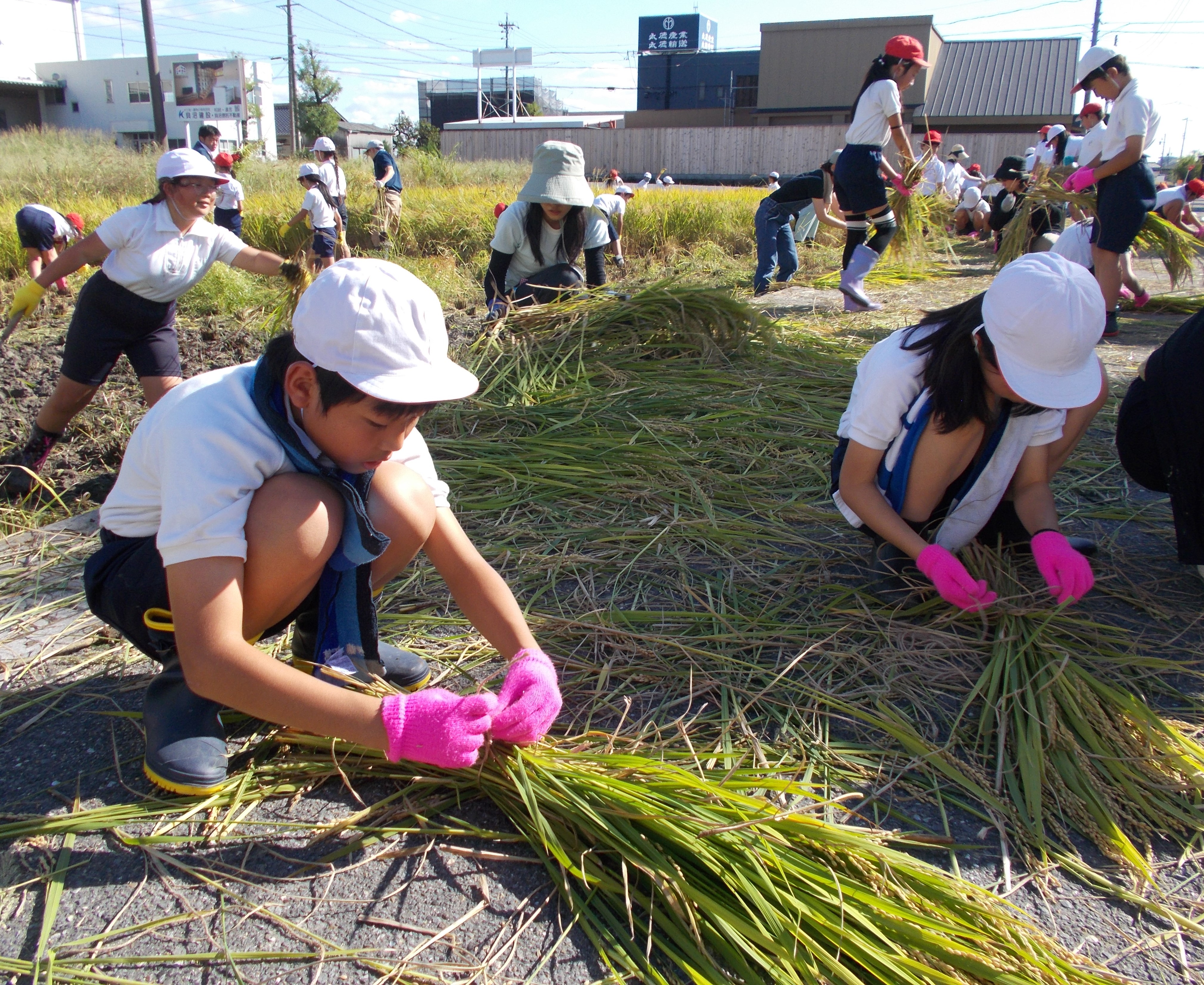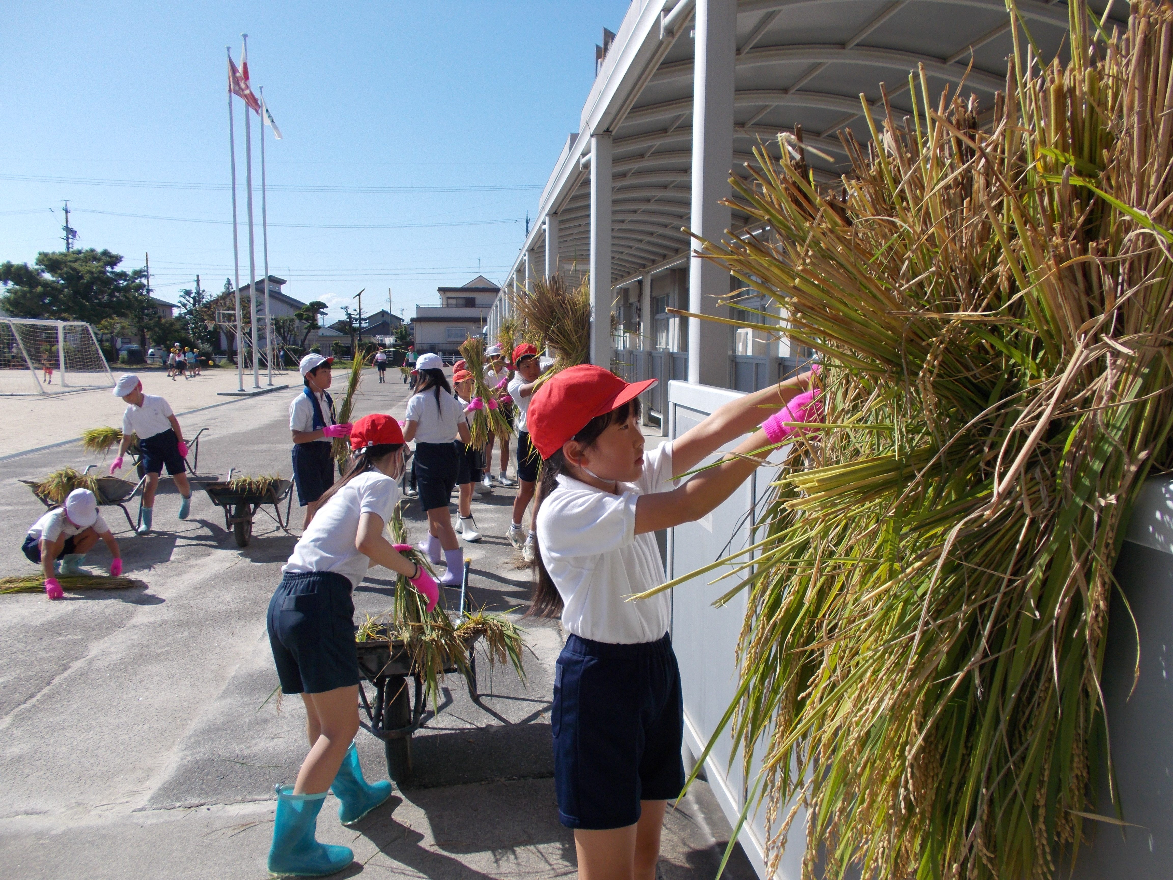 稲刈り(10月17日) 5年生が稲刈りを行いました。春に田植えをしてから数か月。立派な稲になりました。 当日の稲刈りでは、地域の方やJAの方、保護者ボランティアの方々のサポートを受けながら、鎌を使って稲を刈り、束にしてひもで結び、天日で自然乾燥をさせる作業を行いました。 10月末には脱穀を予定しています。楽しみですね。