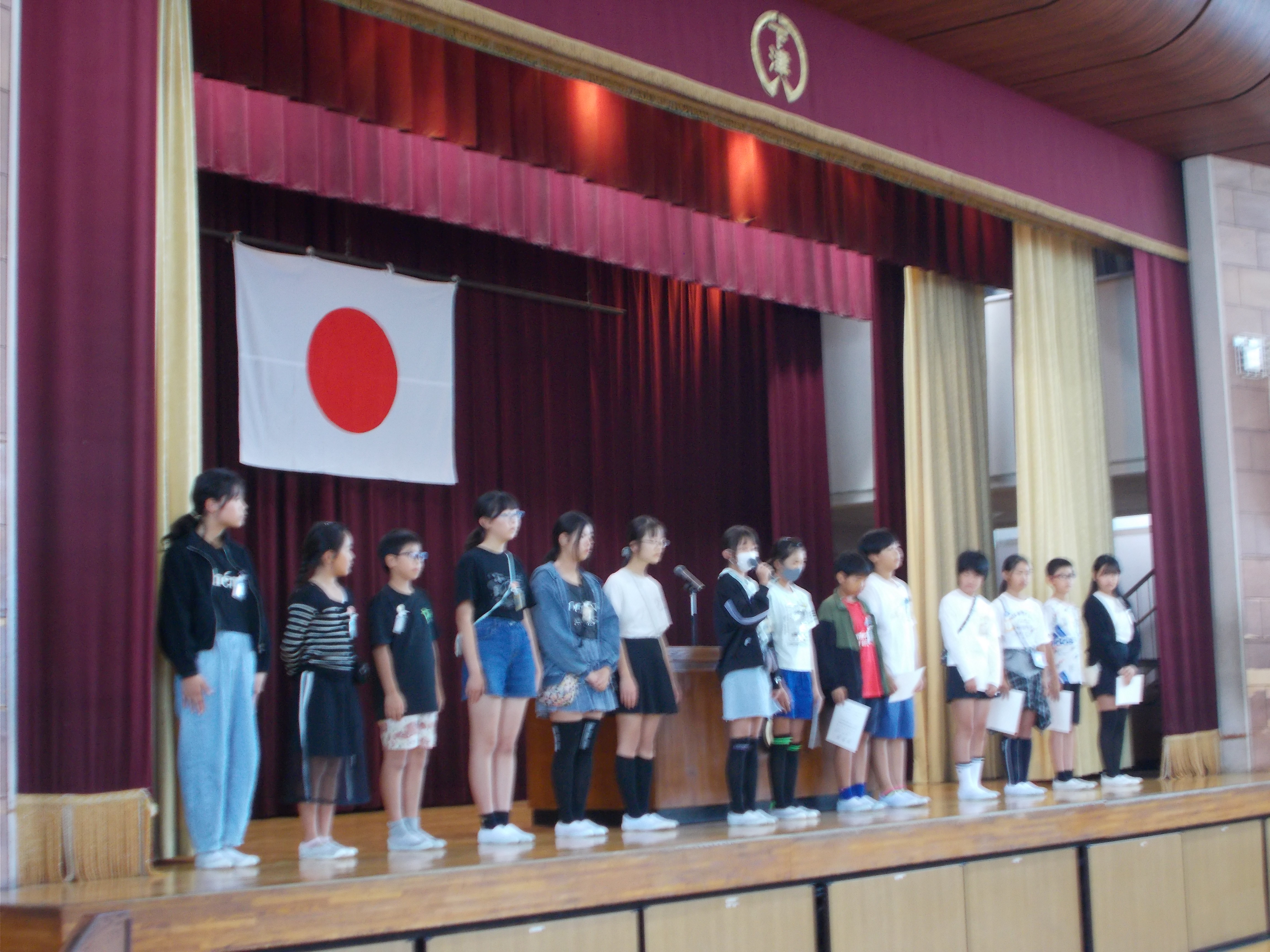 後期児童会・学級委員任命 10月20日の朝礼で、後期児童会役員と後期学級委員が任命されました。 前期児童会長が退任の挨拶、後期児童会長が就任の挨拶をしました。 後期も一人一人が力を発揮し、よいよい学級、学校をつくっていこうという思いを強めました。