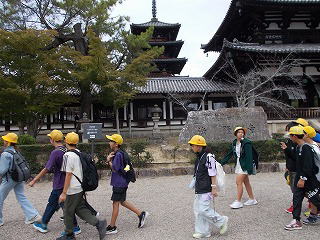 10月17日(金)、18日(土)に京都・奈良に修学旅行に行きました。1日目は、金閣寺、清水寺を見学しました。金閣寺ではバスガイドさんから「金閣寺には正方形の金箔が約20万枚も貼られている」ということを教えてもらいじっくりと建物を眺める様子が見られました。清水寺の参道では、班ごとに分かれ家族や自分へのお土産を楽しみながら選びました。また、午後からは友禅染体験を行い、世界に一つだけのオリジナル作品を作りました。2日目は、東大寺の大きな大仏を生で見ることができ、その迫力に驚きました。その後、班別分散で二月堂・三月堂・正倉院を見ながら奈良公園を歩いて回りました。辺りを見渡すとどこを見ても鹿の姿が見られ、鹿せんべいをあげて鹿との触れ合いを楽しむ児童もたくさんいました。最後に訪れた法隆寺では、五重塔や夢殿など歴史ある建物を見学することができました。充実した二日間を過ごし、素敵な思い出をつくることができました。
