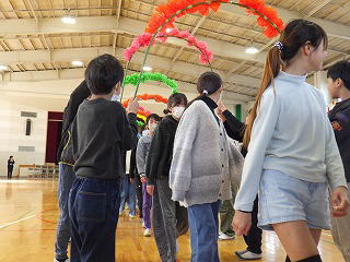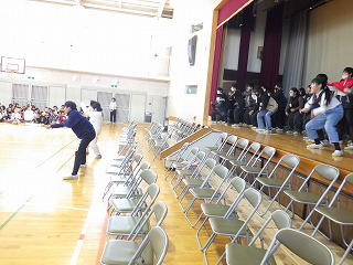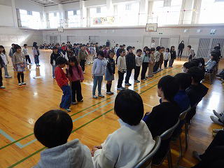 その後、1年生から順番に各学年で考えた歌やダンス、呼びかけ、寸劇などを発表しました。5年生の発表では運動会で踊った「よっちょれ」を「いっしょに踊りませんか!」と呼びかけました。それに応じた6年生全員がステージの上に集まって5年生と6年生が一緒に踊り、送る会は最高潮を迎えました。最後まで和やかな雰囲気で本当によい会になりました。これでいよいよ6年生は卒業式に向かってラストスパートです。