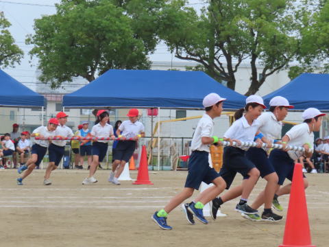 ![]() 高学年 競争遊戯「綱引き」の様子  |