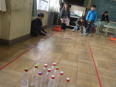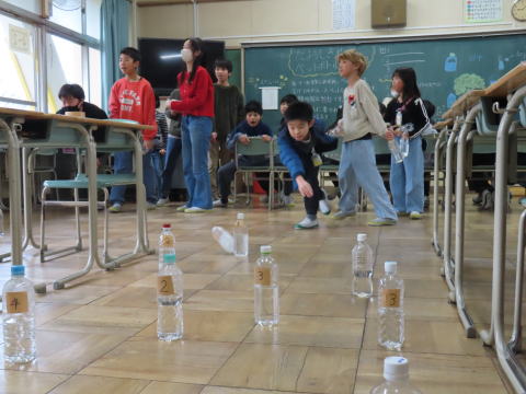 白6「1位を目指せ!ストライク横丁!」 ラップの芯を転がしてストライクを目指す、ペットボトルボーリングをしました。 |