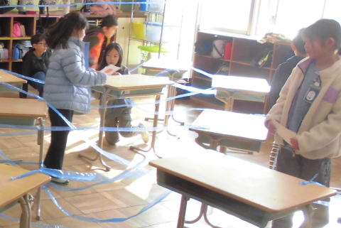 赤1「ペアをさがせ!!大しんけいすいじゃくゲーム」 張り巡らされたテープを避け、隠されたカードを探し、神経衰弱をしました。 |