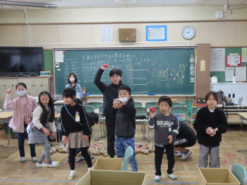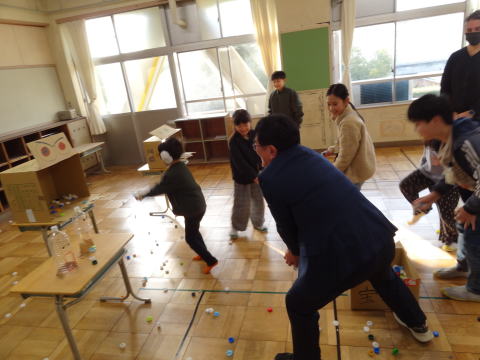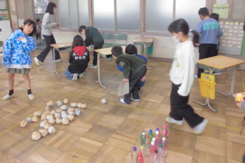 ![]() 白4「たおしきれ!ペットボトルモルック」 番号が書かれたペットボトルをよく狙って投げ当て、高得点をめざしました。 |