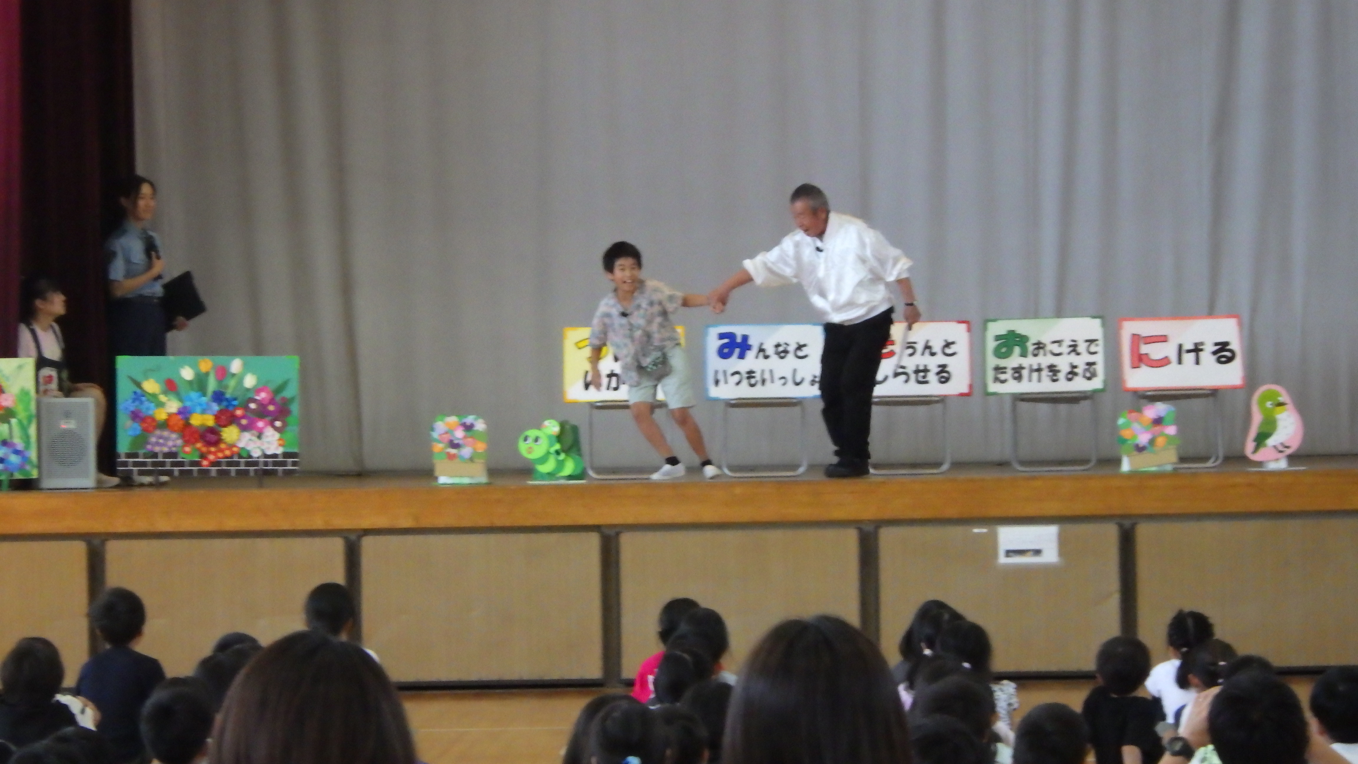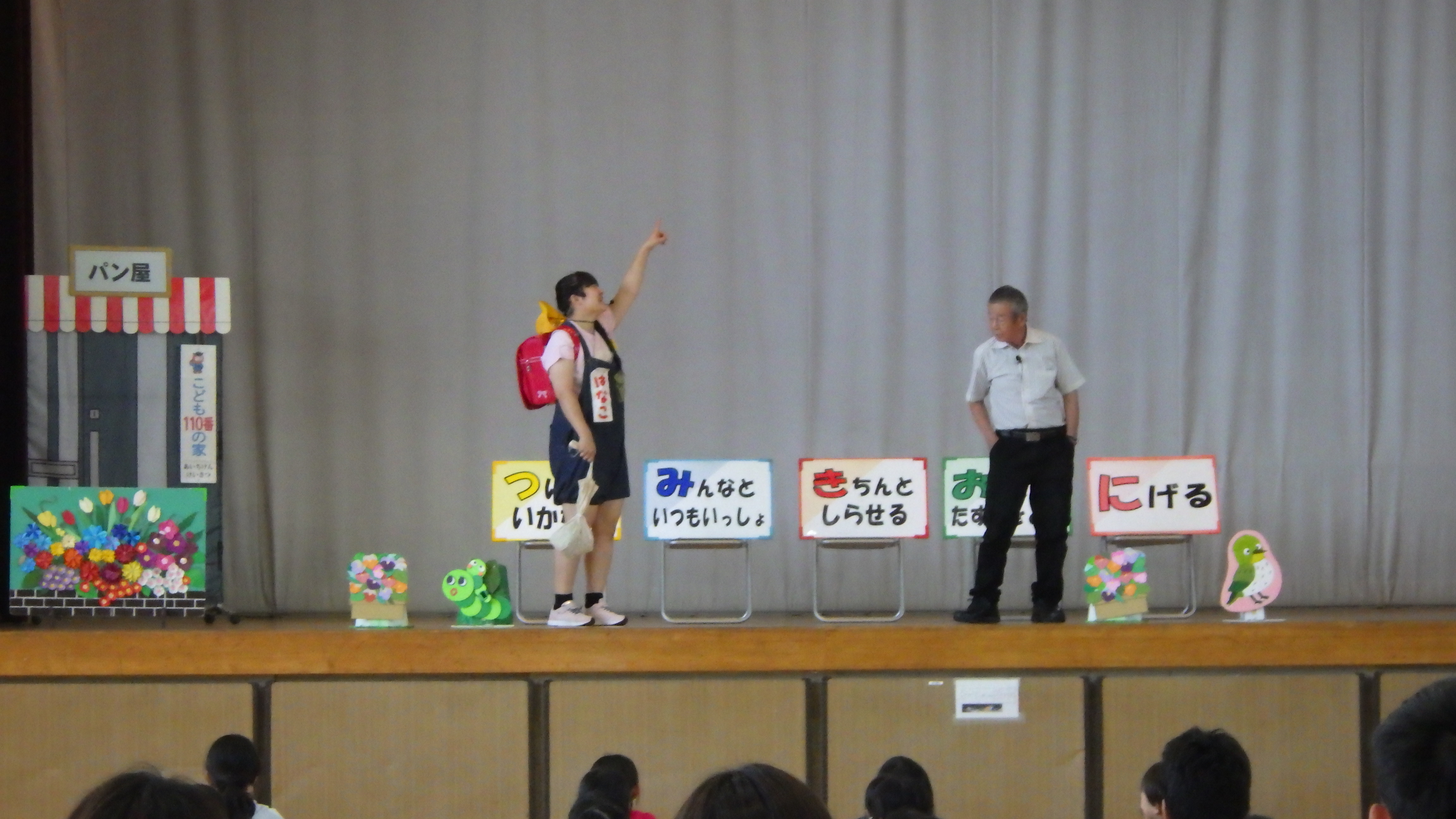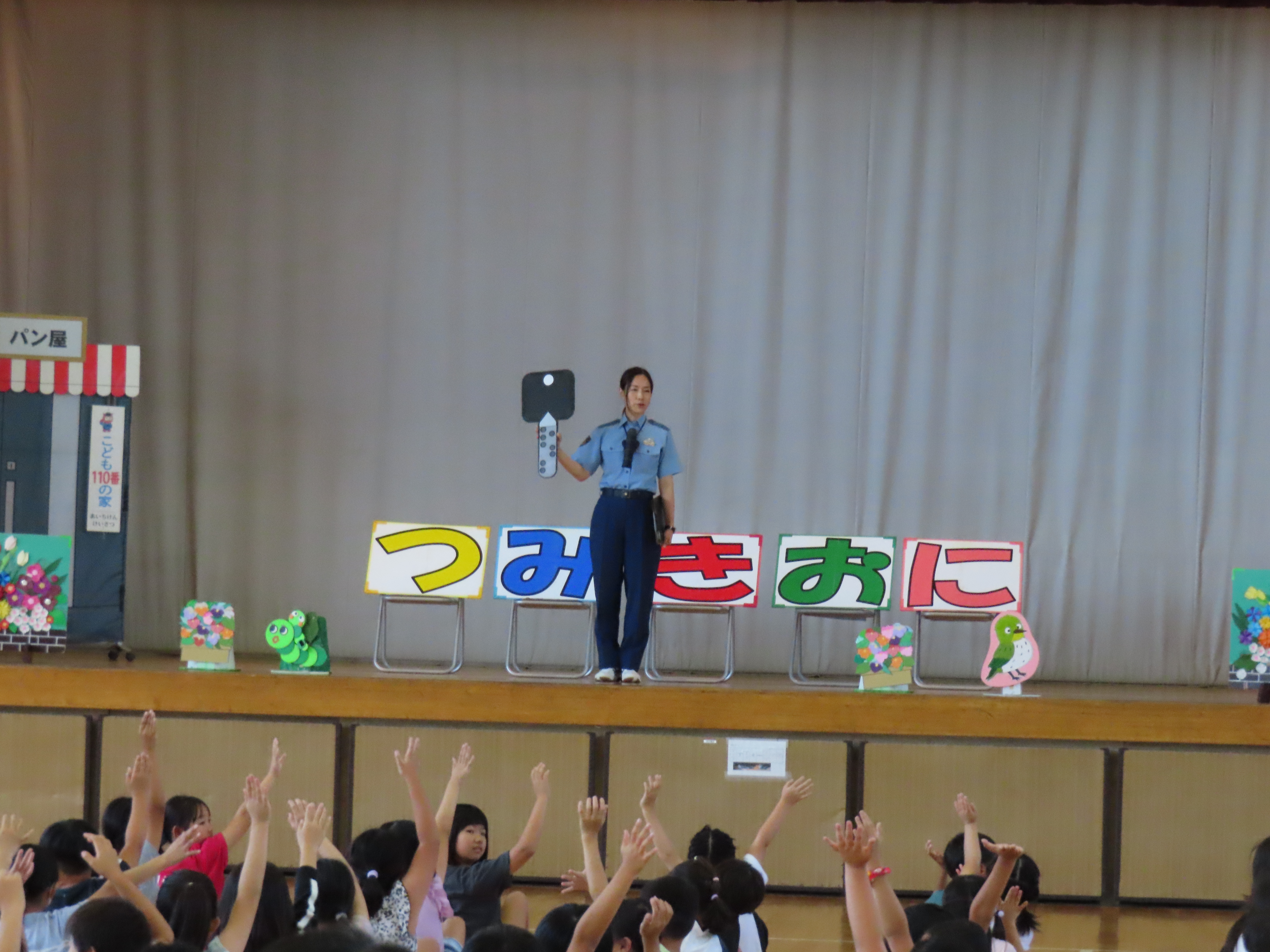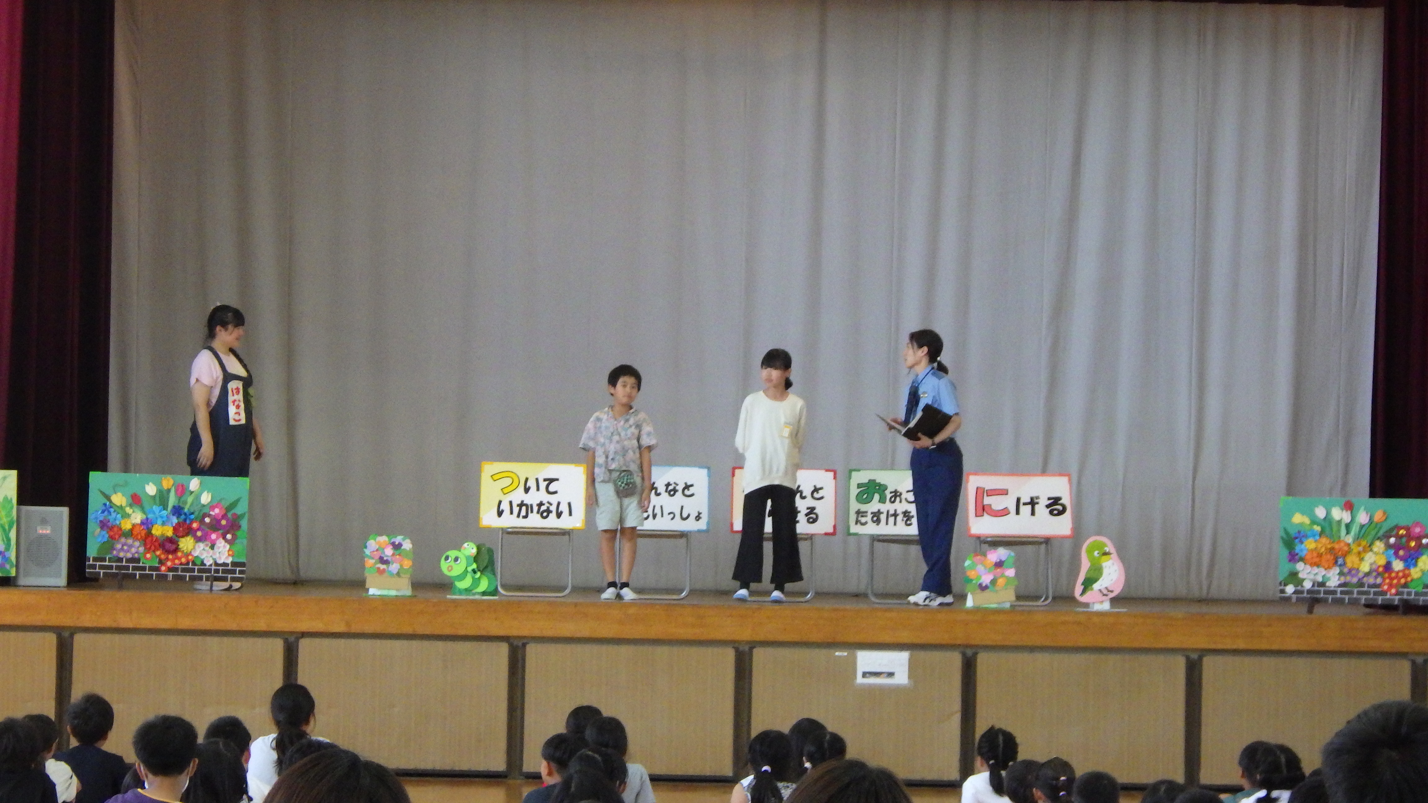 『つみきおに』の大切さを劇で分かりやすく教えていただきました。「それはだめー!」「にげてー!」と、子どもたちは劇に夢中になって、とても楽しそうに、しかし真剣に学んでいました。いざという時に自分の命、自分の安全を守れる坂田っ子になってほしいと思います。