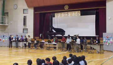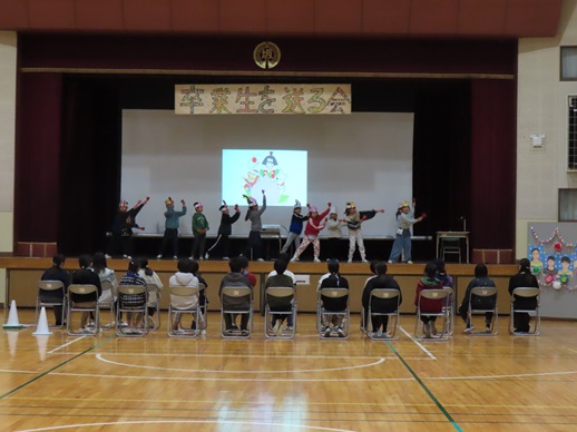 1〜5年生が、劇やクイズ、ダンス、思い出のアルバムスライドなどの出し物を披露して、感謝の思いを伝えました。6年生のたくさんの笑顔が見られ、心温まる会となりました。6年生からも、会を開いてくれたお礼に、合奏のプレゼントがありました。