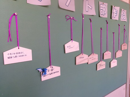 タブレット・クラフト部では一人一つずつ、絵馬を作成しました。将来の希望、夢、今の願いなどをそれぞれ書き込みました。学校公開日まで展示しますので、保護者の皆様もぜひご覧ください!