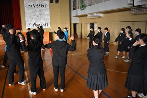 若狭宿泊学習に向けて、1年生は各クラスでスタンツや校歌の練習を進めています。千代田中学校の校歌は合唱。3つのパートに分かれながら、正しい音程で歌えるように練習をしています。どのクラスも楽しく、真剣に取り組めていました。