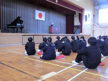 生徒集会では、はじめに生徒会執行部から、今年度の取組内容と1月28日(水)に行われる「平和町のこれからを語る会」についてのアンケート依頼がありました。全校生徒が主体なって、平和町のまちづくりを考えていきます。次に、道徳科を担当する先生から、「いじめ」についての講話がありました。人を傷つける言動は、誰の心にも深い傷を残します。安心して笑顔で過ごせるように、思いやりと優しさを大切にする心を育てています。 |