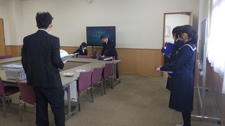 1月28日(水)に行われる「平和町のこれからを語る会」に向けて、準備が進んでいます。昼休みには、生徒会メンバーが会議室に集まって、司会進行のリハーサルを行っています。よりよい平和町にするために、地域の方々と楽しく充実した話し合いができるように、しっかりと準備を進めていることをとてもうれしく思います。 |