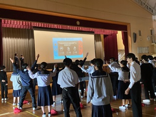 生徒集会では、はじめに6人の前期委員長から、最後のあいさつがありました。その後、ピースレンジャー(黄色)が登場し、「返事で盛り上げよう」ゲームを行いました。ピースレンジャーがクラスごとに質問をし、どれだけ元気よく「はい」という返事できるかを競うゲームです。「元気いっぱいに学校生活を送っていますか?」「毎日、給食は楽しみですか?」などの問いかけに、一生懸命に返事をする生徒たちの姿がありました。5つの実行の一つである「返事」をしっかりと意識して、気持ちよい毎日を過ごしましょう。 |