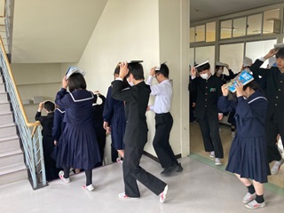 26日(木)3時間目に、不審者対応の避難訓練を行いました。不審者が侵入してきたときの職員の対応や生徒たちへの避難指示、そして、生徒たちの安全な避難行動の仕方などを訓練をしました。避難完了後には、安全指導担当の先生から、今回の訓練を通して、自分や仲間の命を守るための行動や登下校中に不審者に出会った場合の対応について、具体的に分かりやすくお話をしていただきました。 |