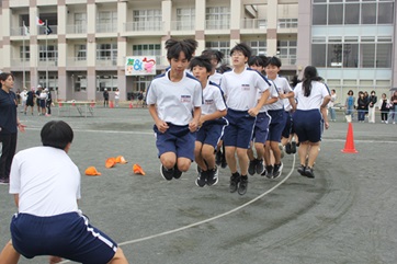 生徒会スローガン「友&愛」を掲げ、体育祭が行われました。ピースレンジャーによるオープニングセレモニーで始まりました。そして、玉入れや障害物リレー、長縄跳び、学級別対抗リレーなどの競技が行われました。失敗しても挑戦する姿や最後まであきらめずにゴールする姿、仲間と励まし合って応援する姿、仲間と力を合わせて活動する姿など、生徒たちのひたむきさにとても感動しました。一人ひとりがやりきったという達成感を味わうことができた体育祭となりました。 |