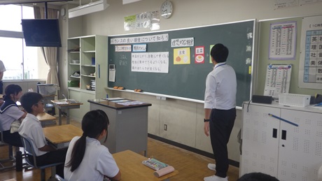 9月29日(月)からの3週間、「先生になる」という夢を叶えるために教育実習生が来ています。学級経営に関わったり、授業を行ったり、行事に参加したりと大切なことを学んでいます。今日は、体育「球技」の研究授業がありました。笑顔を絶やさずに、子どもたちに指示を出したり、大事なポイントを示したりと、生き生きと授業する姿がありました。実習を通して、「子ども成長を間近で感じる」ことのできる先生の魅力を知ってほしいと願っています。 |
