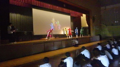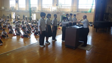 生徒集会では、はじめに6人の前期委員長から、最後のあいさつがありました。その後、ピースレンジャー(黄色)が登場し、「返事で盛り上げよう」ゲームを行いました。ピースレンジャーがクラスごとに質問をし、どれだけ元気よく「はい」という返事できるかを競うゲームです。「元気いっぱいに学校生活を送っていますか?」「毎日、給食は楽しみですか?」などの問いかけに、一生懸命に返事をする生徒たちの姿がありました。5つの実行の一つである「返事」をしっかりと意識して、気持ちよい毎日を過ごしましょう。 |