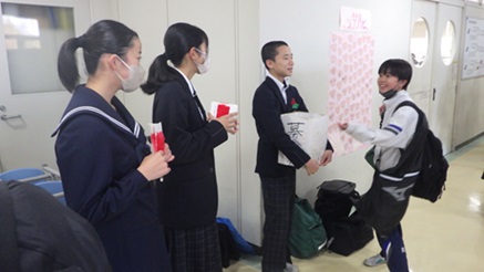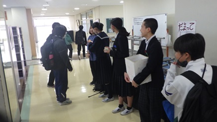 生徒会では、12月1日(月)〜5日(金)まで、赤い羽根共同募金の活動を行っています。生徒会執行委員が昇降口に立ち、「おはようございます。募金に協力をお願いします」とさわやかに呼びかけています。赤い羽根共同募金は、地域福祉の支援や災害時の支援に役立てられています。募金活動を通して、助け合いや支え合いの心を育てています。 |