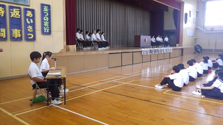 後期生徒会執行委員を務める7人が全校生徒の前で立会演説を行いました。今年度は後期生徒会執行委員として2年生4人、1年生3人の生徒が立候補をしました。それぞれの立候補者を支える推薦責任者の生徒を含めた14人が、「よりよい学校を創っていきたい」という思いをしっかりと込めて演説をしていました。前期生徒会の頑張りを引き継ぎ、後期の学校も盛り上げていってほしいと思います。 | ![]() |