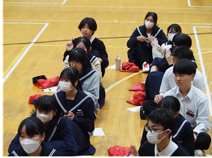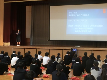 生徒集会では、はじめに生徒会執行部から、今年度の取組内容と1月28日(水)に行われる「平和町のこれからを語る会」についてのアンケート依頼がありました。全校生徒が主体なって、平和町のまちづくりを考えていきます。次に、道徳科を担当する先生から、「いじめ」についての講話がありました。人を傷つける言動は、誰の心にも深い傷を残します。安心して笑顔で過ごせるように、思いやりと優しさを大切にする心を育てています。 |