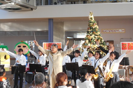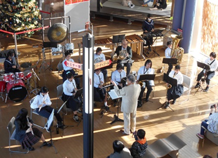 平和らくらくプラザにて、らくプラフェスタが開催され、吹奏楽部1・2年生がイベントに参加しました。「繚乱〜能『桜川』の物語によるラプソディー〜」、「青と夏」、「宝島」の3曲を演奏しました。部員によるソロやスタンドプレーを取り入れたり、観客から手拍子をしていただいたりするなど、楽しい演奏となりました。地域とのつながりを改めて実感できた演奏会でした。 |