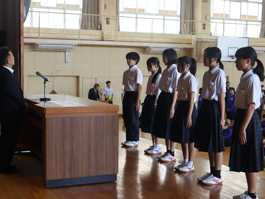 朝礼で後期生徒会役員と学級三役の任命を行いました。交代式では、前期生徒会役員の熱い思いとともに新たなバトンが渡されました。校長講話では、立候補者のスピーチについてのお話がありましたので紹介させていただきます。