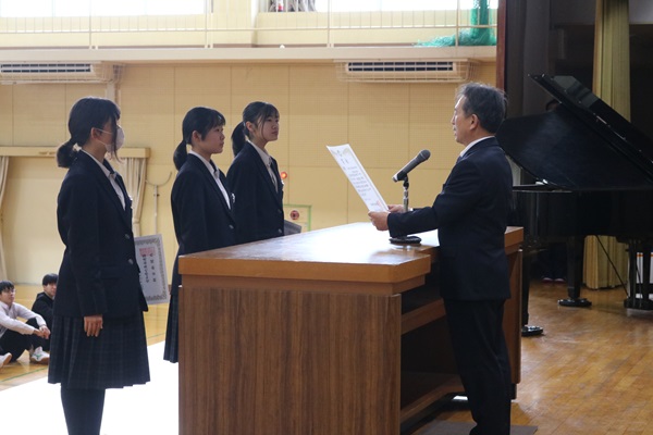本日、無事に3学期の始業式を行うことができました。ありがとうございます。本年もどうぞ、よろしくお願いします。以下に校長先生の講話を紹介させていただきます。また、本日は、吹奏楽部の生徒の表彰も行いました。