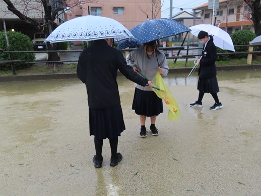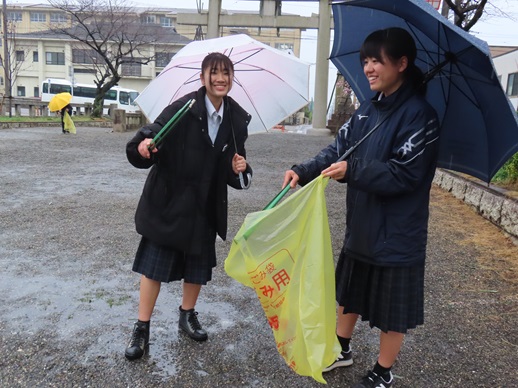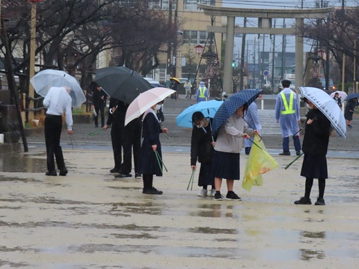 朝の清掃の時間に、参道の清掃を行いました。37名の生徒が参加しました。小雨の中でしたが、布の切れ端やたばこの吸い殻などを積極的に集めてくれました!