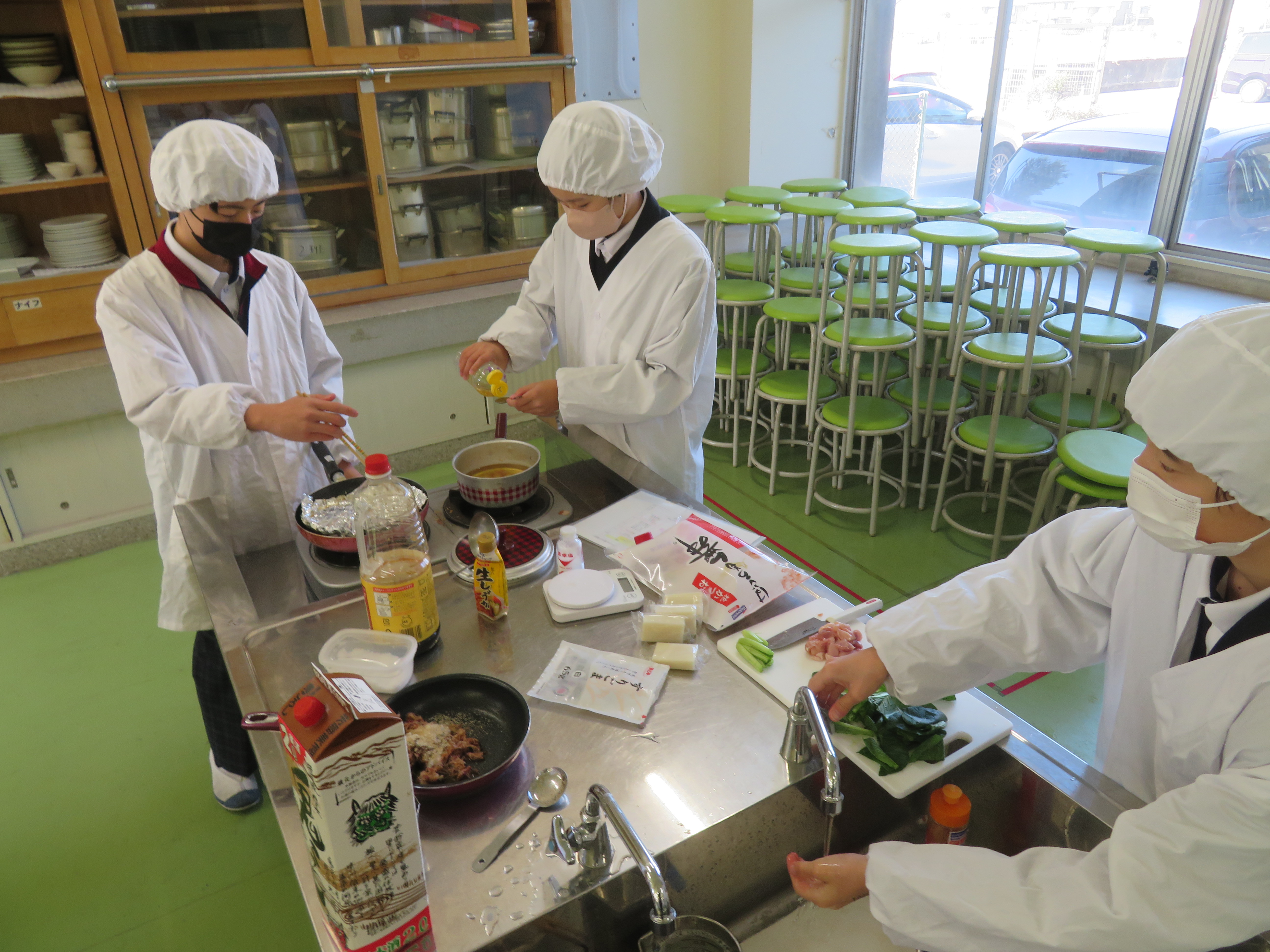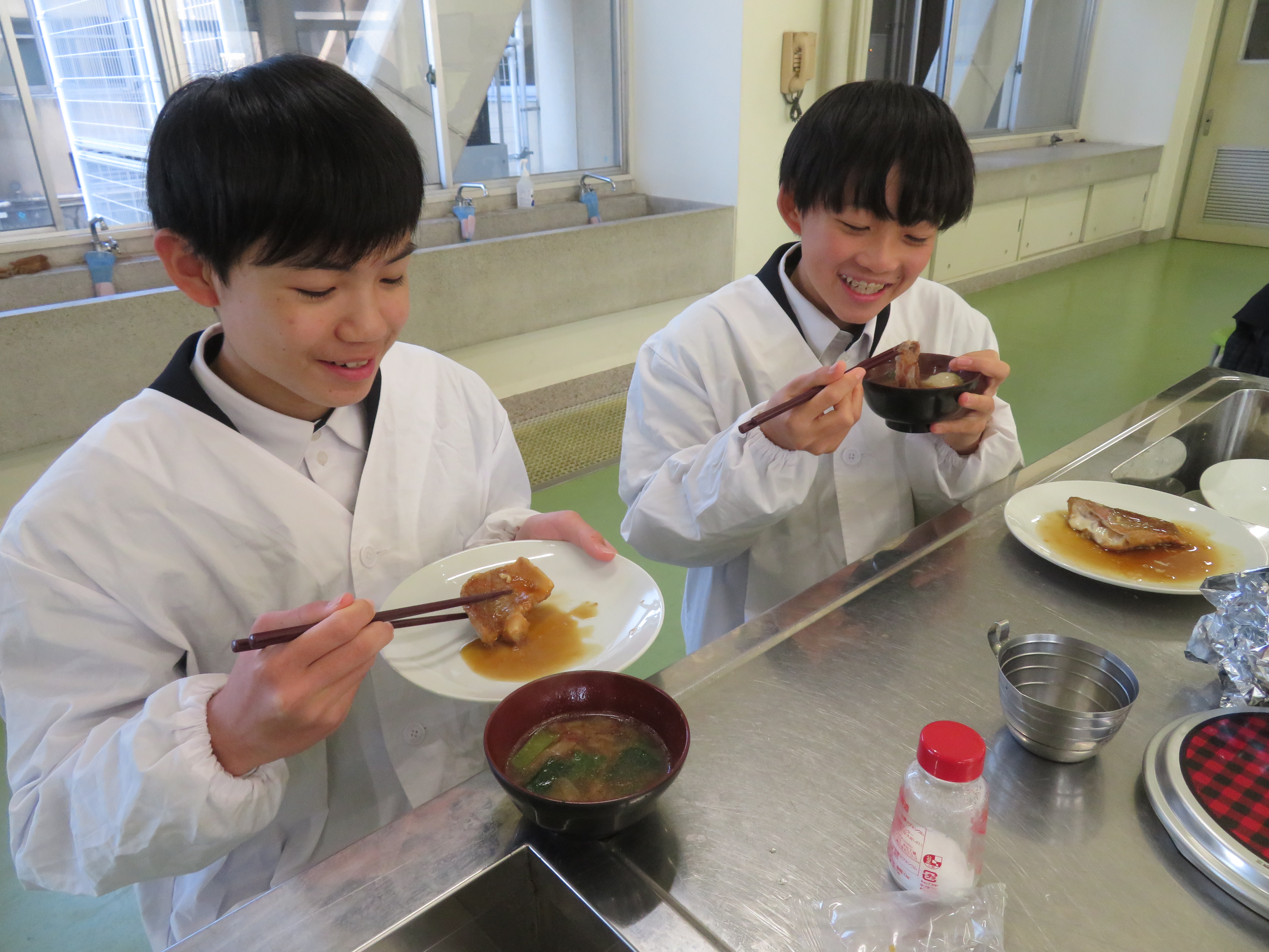 1年生家庭科・調理実習 1年生の調理実習の献立は、「赤魚の煮付け」と「雑煮」です。 小学校では「ゆでる」調理と「炒める」調理を学習してきましたが、今回は「煮る」調理に挑戦しました。かつお節からだしを取り、餅と鶏肉とほうれん草を入れて雑煮にしたり、魚の切り身からおいしく調理したりしました。どの班も上手に出来たようで、作った料理を幸せそうに堪能していました。 1年生のみなさん、冬休みにはぜひ家庭でも作ってみてくださいね!