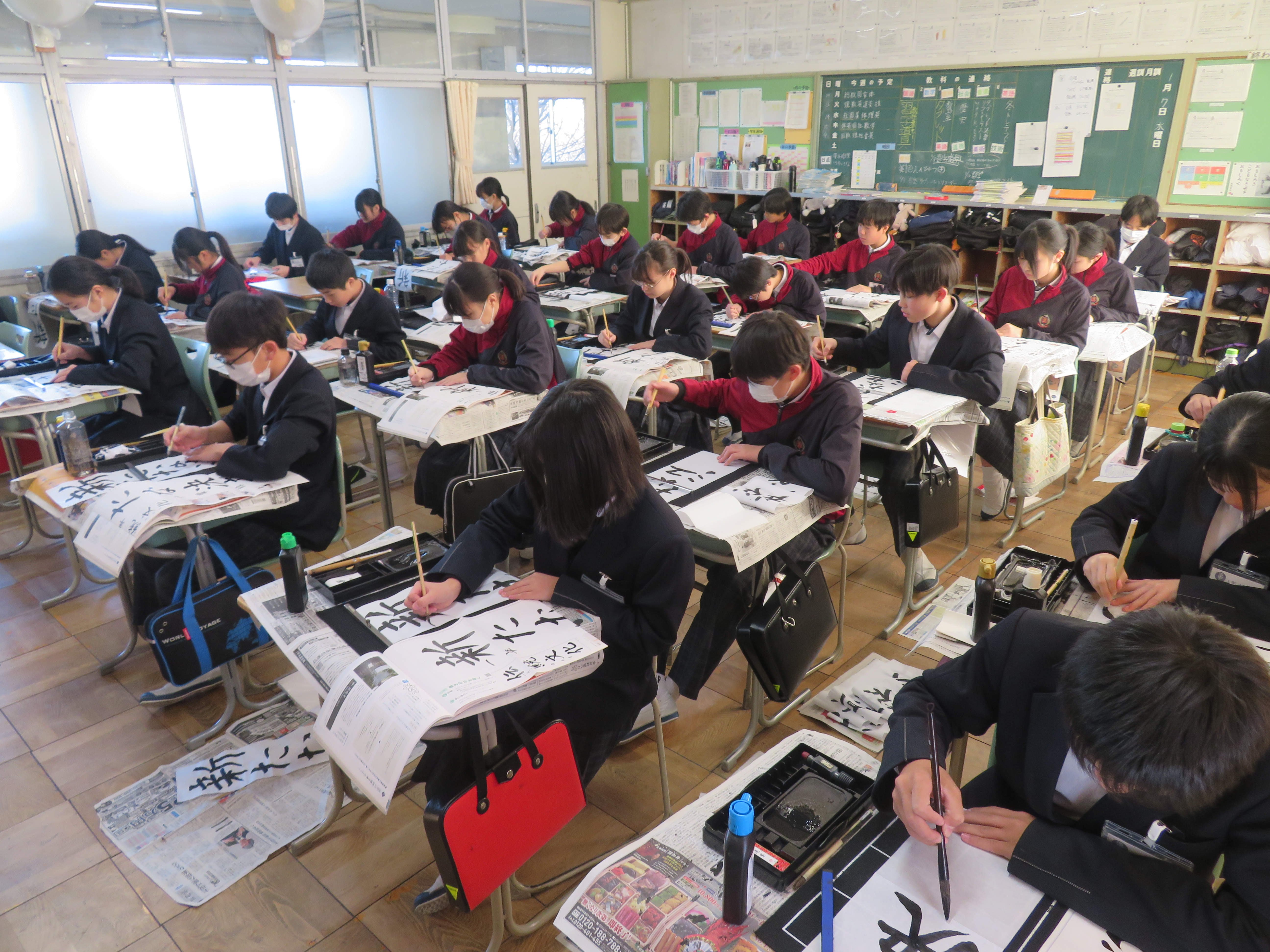 書き初め(1年生) 1年生国語科、3学期はじめの授業で書き初めを行いました。 普段使用している半紙とは異なり、細長い紙(書き初め用紙)に書くため、文字の配列が難しく、何度も練習をしました。どの生徒も教科書の手本をよく見て、真剣に書き上げていました。 書いた文字は「新たな決意」です。中学校生活に慣れてきましたが、まもなく2年生になります。気持ちを新たに目標を決めて、努力を積み重ね、さらに素敵な治中生になってほしいと思います。