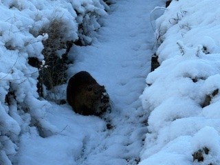白い世界だからこそ分かること 朝、みんなが登校を終えた後、学校前の田んぼのあぜ道に、何やら茶色い動く物が・・よく見るとヌートリアでした。雪が積もり、周りが白かったからこそ気付いた1枚です。雪が降った朝、寒い寒いと下を向かずに顔を上げて周りを見ると、何か新しい発見があるかもしれませんね。
