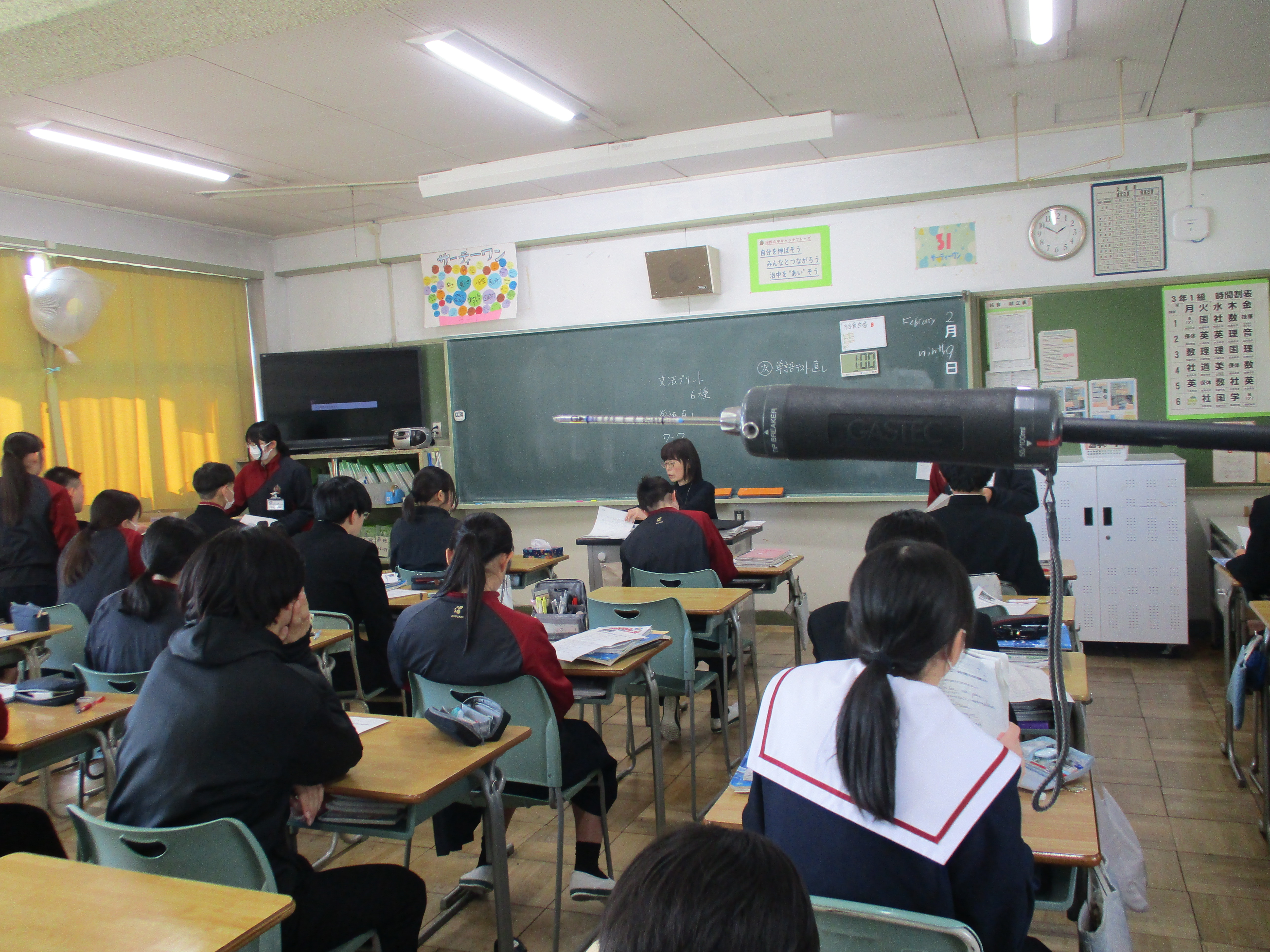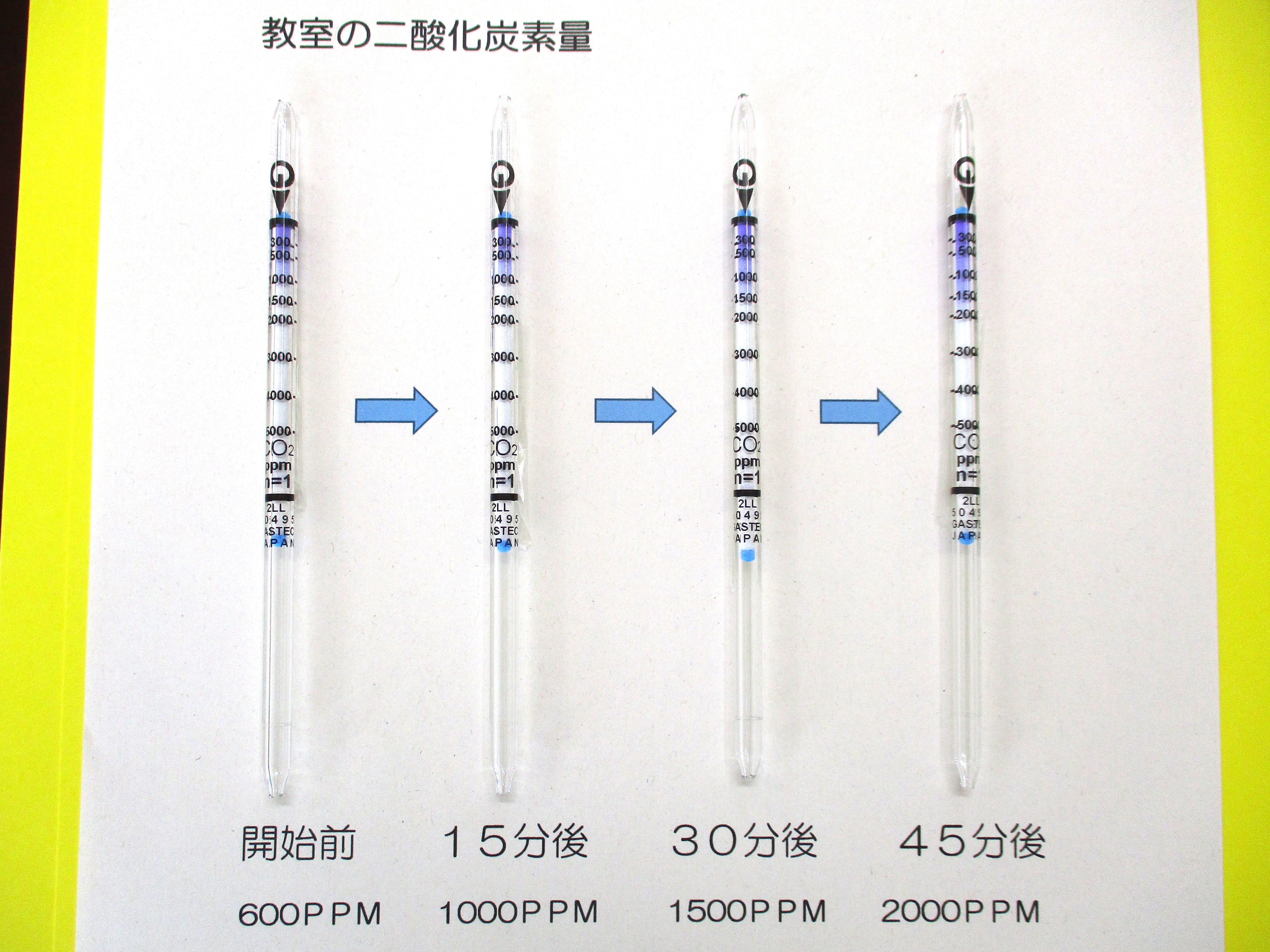 空気の検査を行いました 二酸化炭素量の検査を学校薬剤師の先生に行ってもらいました。 教室内の二酸化炭素量は、45分経過すると測定開始前の約3倍以上(600ppm→2000ppm)になっていました。二酸化炭素の量が多いと、眠気を生じたり集中力が低下したりします。インフルエンザを予防するためにも、毎放課しっかり換気をすることが大切です。 残りの3学期、綺麗な空気の中で元気に過ごしましょう。