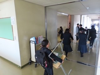 大移動 最後の学活終了後に、令和8年度に向けて、机とイスの移動を行いました。来年度は、教室配置が変更することもあって、机とイス合わせて700台以上の大移動となりました。1・2年生で力を合わせて、あっという間に運び終わりました。