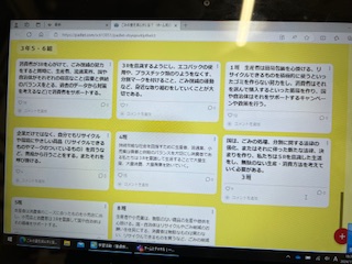 Padletを活用した研究授業(保健) 3年男子保健で研究授業を行いました。「Padlet」という掲示板アプリを活用し、それぞれの考えを効率よく共有しながら、「持続可能なごみの処理」について考えました。写真は、最後に班でまとめた内容の一覧です。消費者・生産者・小売店・国や自治体の4者が、それぞれの立場でできることをやっていくとよいという声が多く聞かれました。