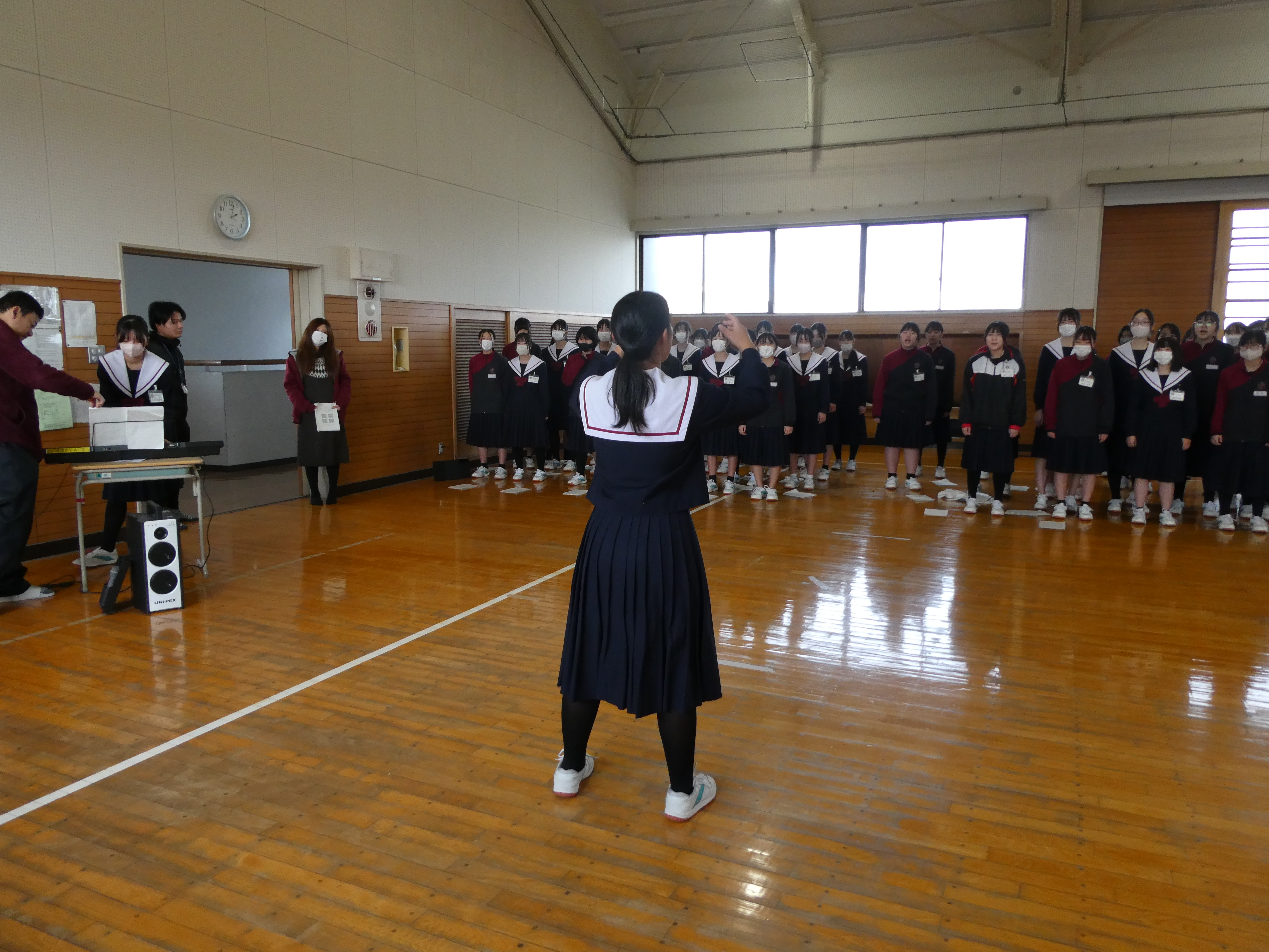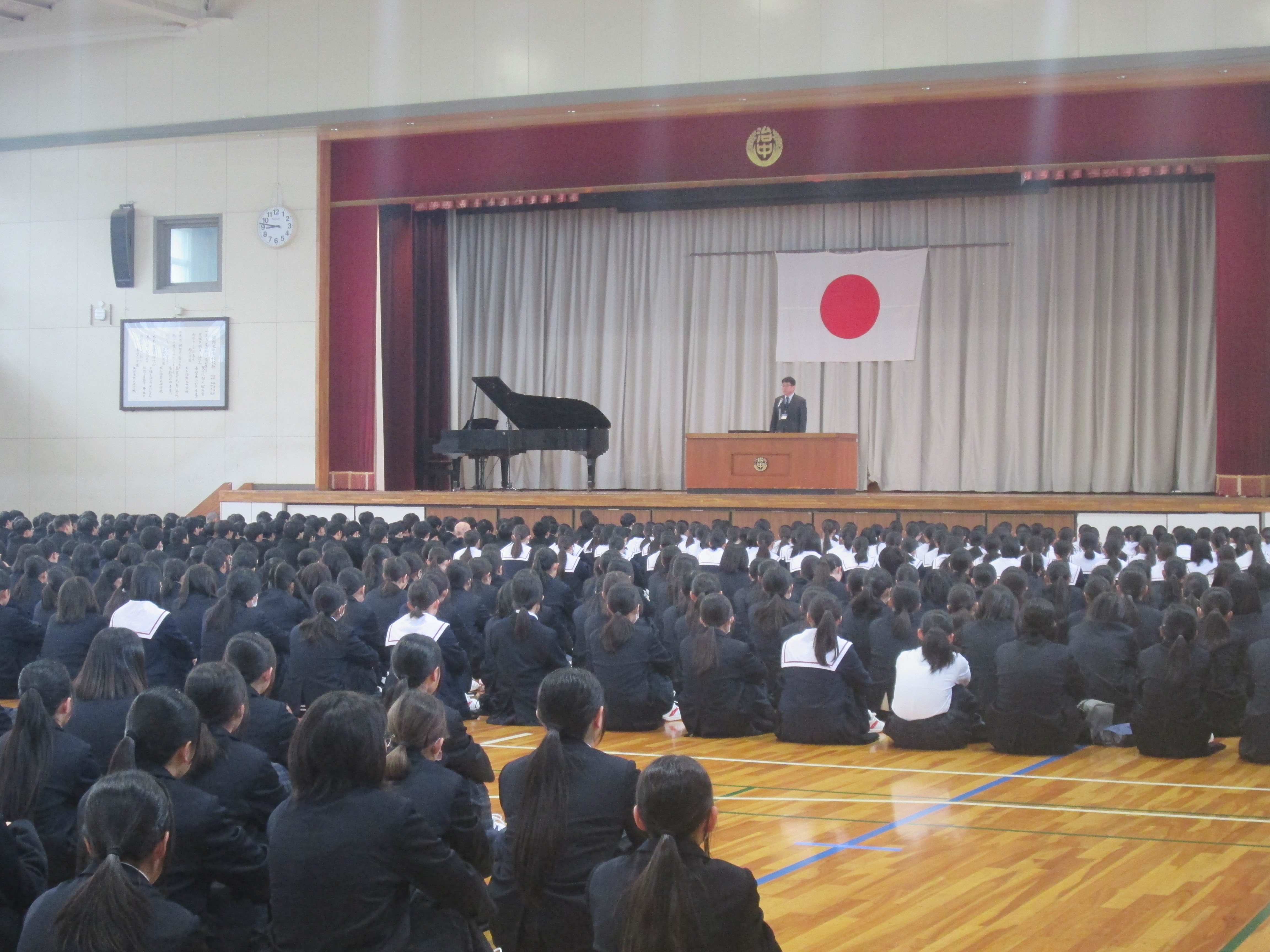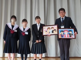 本年度スタートした「マイナビタイム」、今日は全校一斉に体育館で行いました。本年度3月をもって退任される校長先生へ、サプライズで感謝を伝える会となりました。生徒会執行部が中心となって、各クラスで寄せ書きを作成し、素敵な似顔絵とともに校長先生へ贈りました。代表生徒によるインタビューや感謝のメッセージなど、とても温かい時間が流れました。