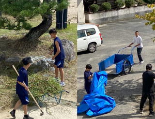 | 10月5日(日)に、地域の皆様やPTA、PTA OB会の皆様に行っていただいた除草作業の仕上げ作業を、里中生で行いました。刈っていただいた草を集めて集積場まで運びました。たくさんの草があって大変でしたが、地域の皆様の思いを受け継ぎ、学校中をきれいにすることができました! |  |  |